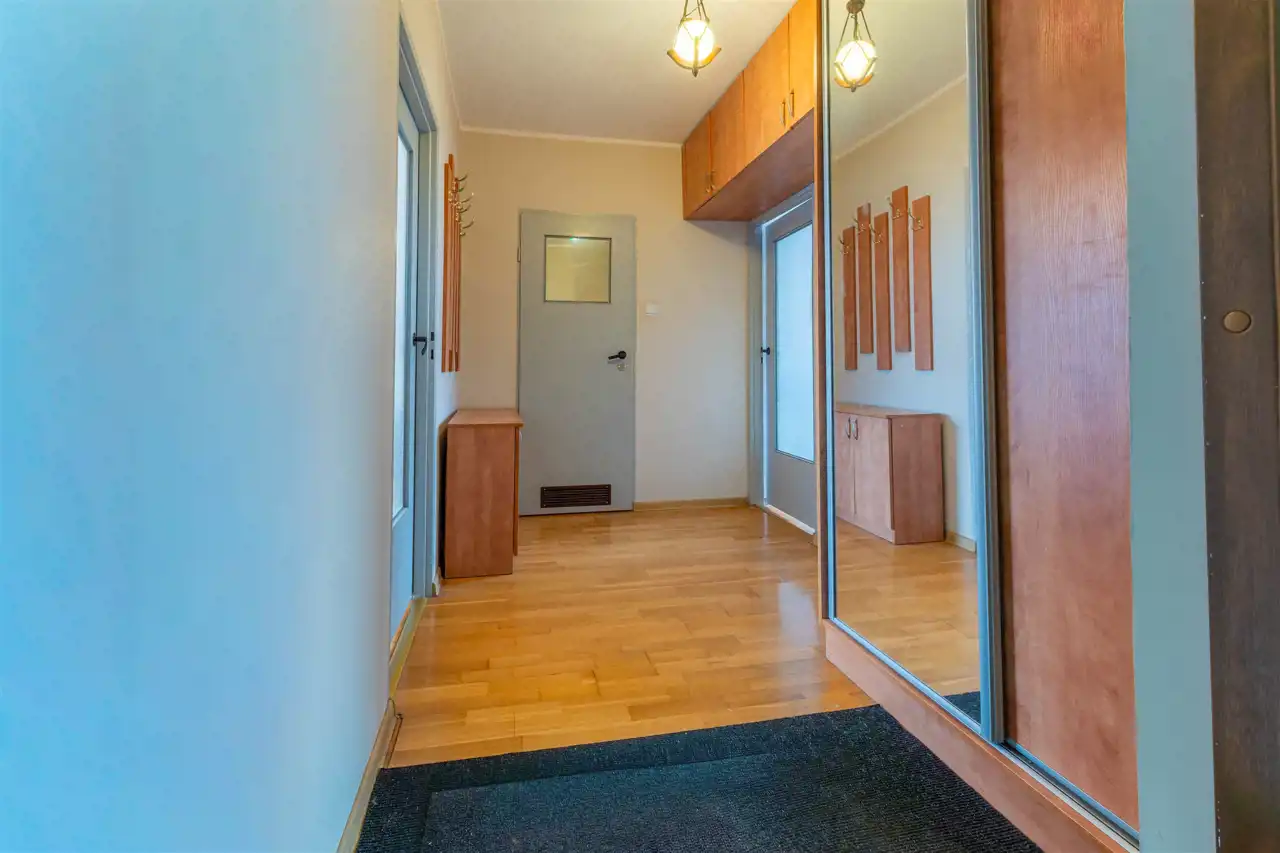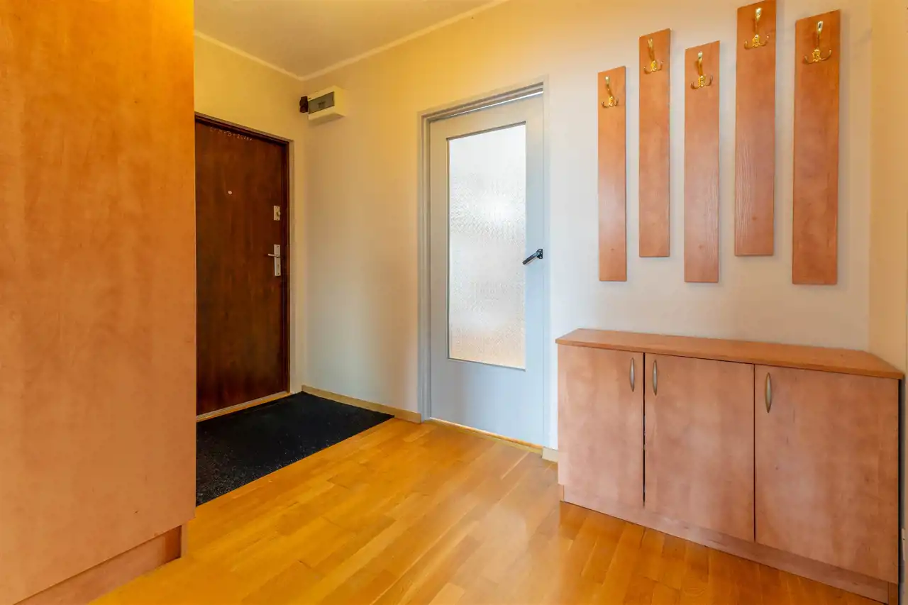- Przedpokój z dużą wbudowaną szafą i dodatkowymi szafkami wiszącymi
