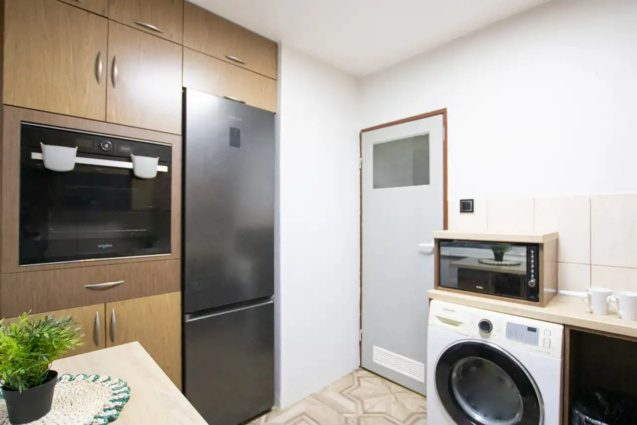 -Kuchnia: zabudowa meblowa, płyta indukcyjna, piekarnik, zlewozmywak, zmywarka, lodówka, pralka,