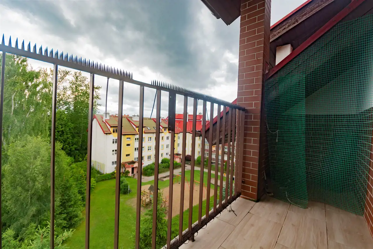 balkon z widokiem na zieleń i plac zabaw