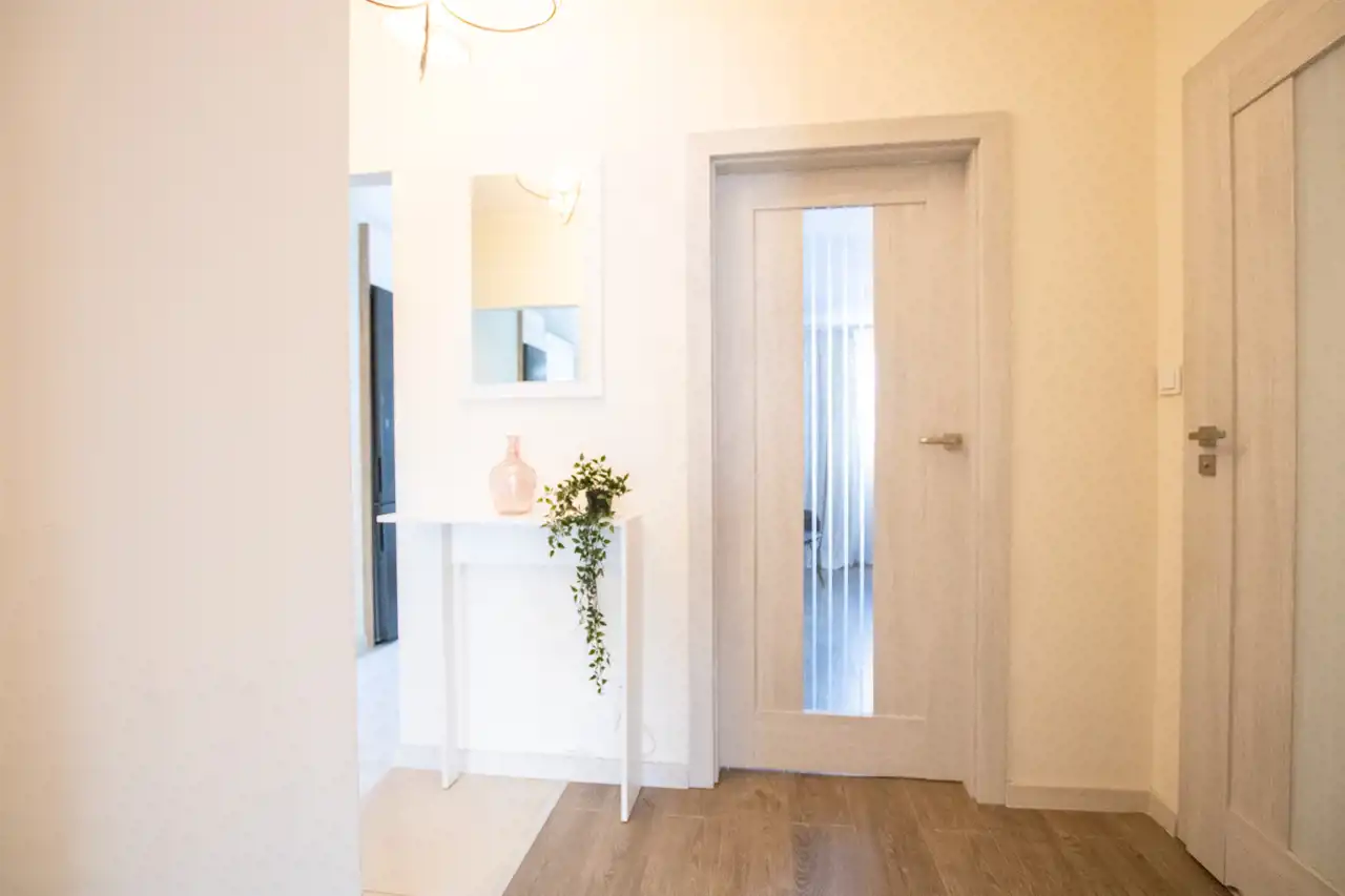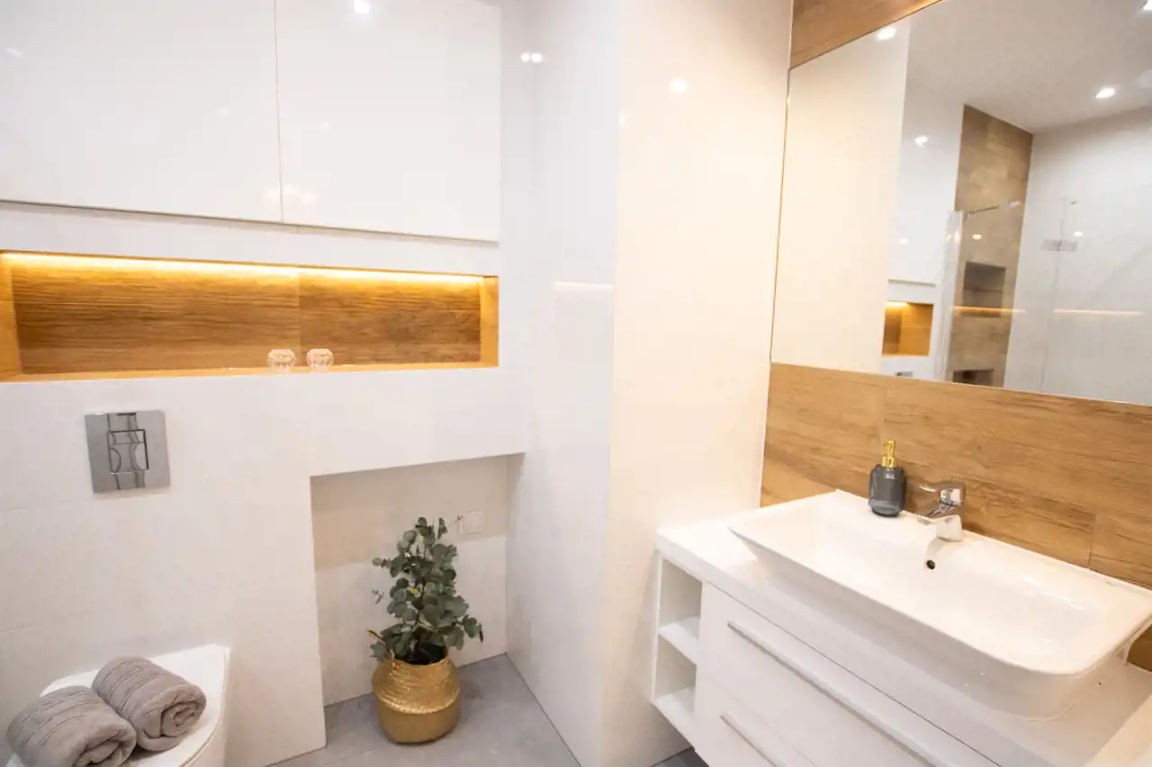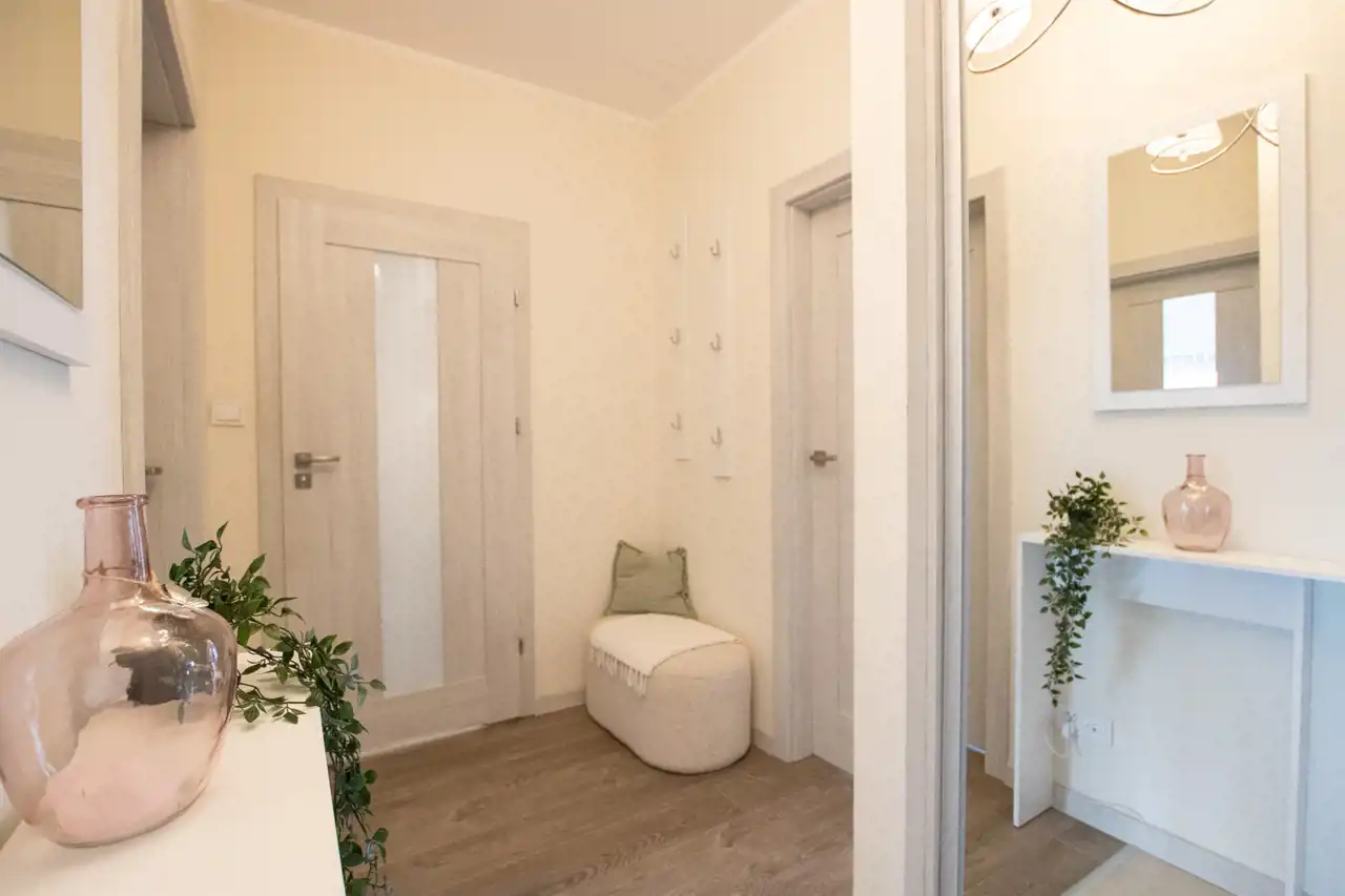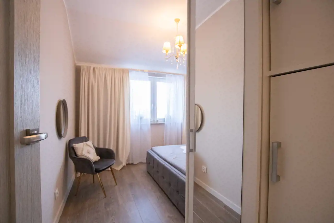 Mieszkanie o powierzchni 54,47 m2 , składające się z przestronnego salonu z wyjściem na balkon, z którego rozciąga się przyjemny widok na zieleń, oddzielnej kuchni, sypialni, łazienki oraz przedpokoju. Kuchnia w pełnej zabudowie z wyposażeniem, z której okna można podziwiać widok na jezioro. Łazienka jest przestronna i nowoczesna – znajduje się w niej duży prysznic z odpływem liniowym oraz miejsce na pralkę.