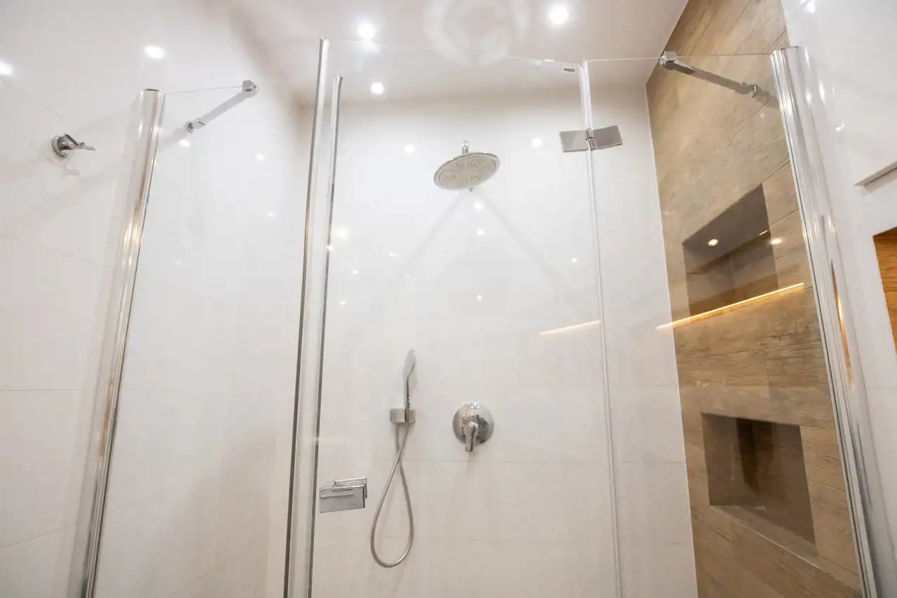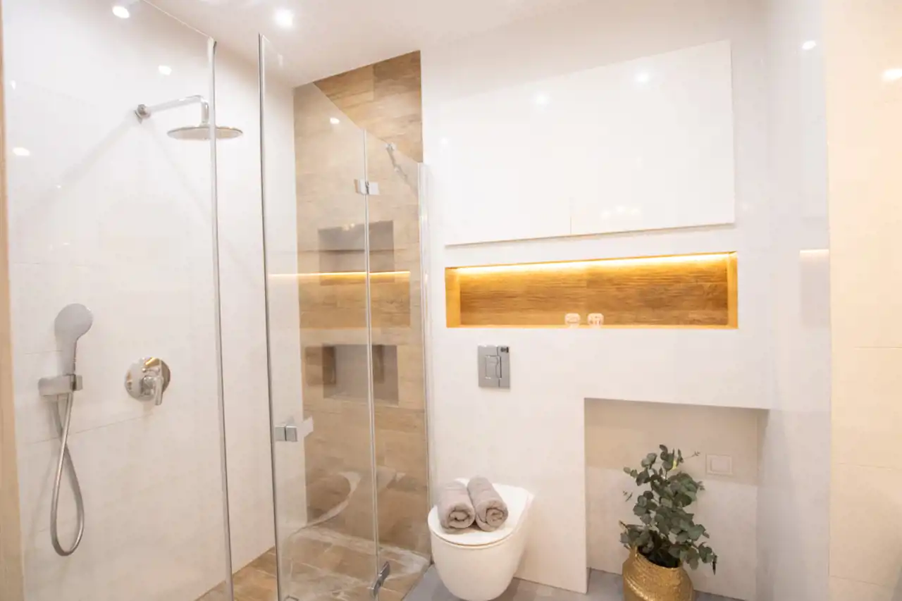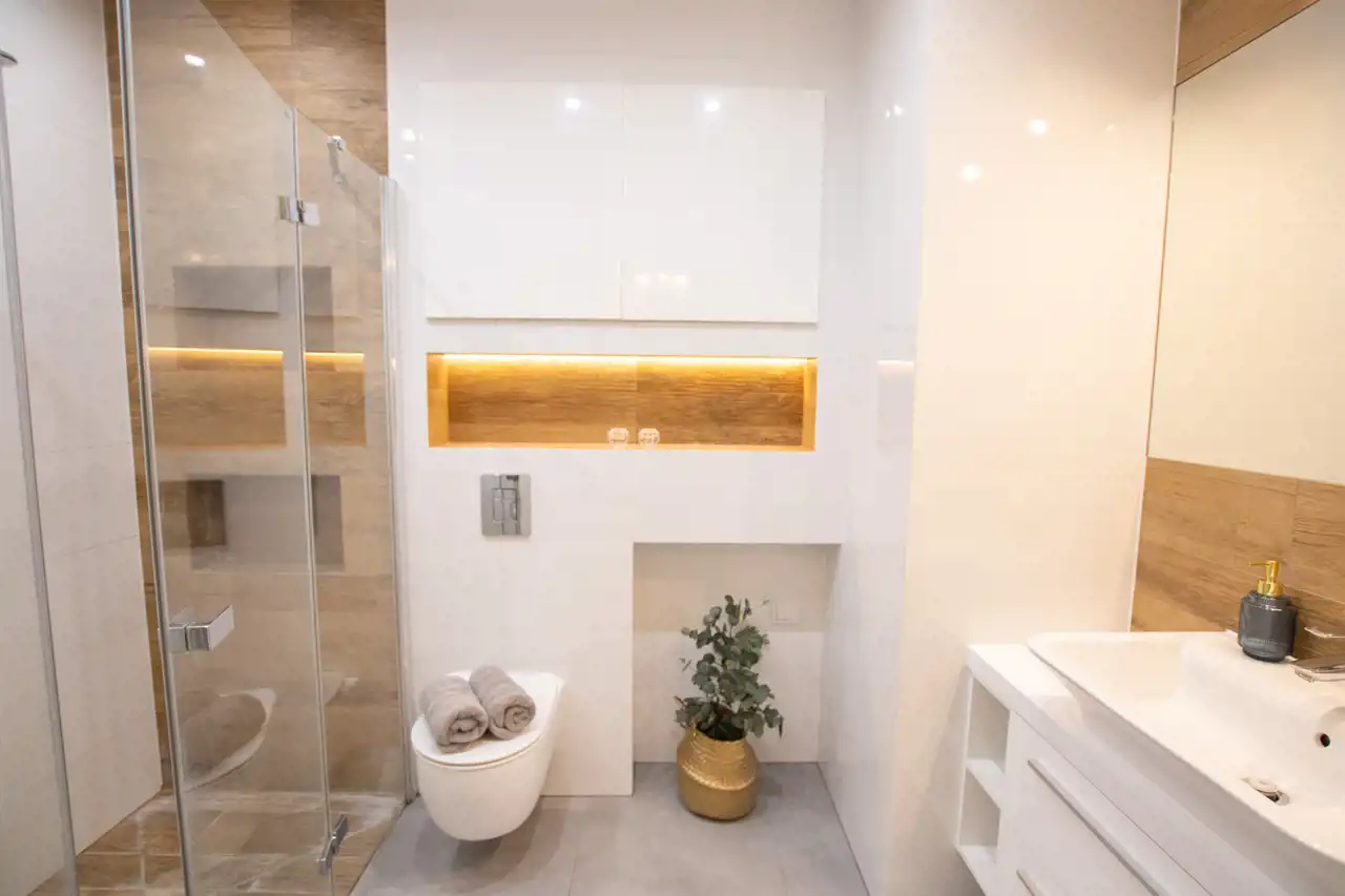 -Łazienka z WC - prysznic, szafka ze zlewem, miejsce na pralkę