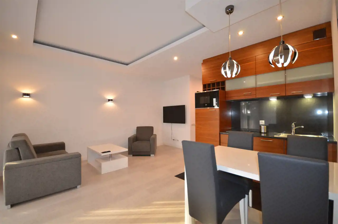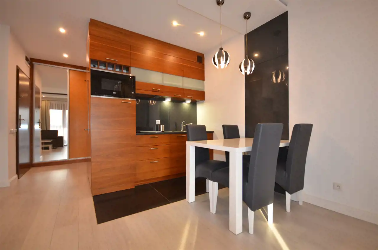 Wykończony w eleganckim i nowoczesnym stylu oraz w pełni wyposażony apartament o pow. 45,29 m2 położony na parterze, składa się z komfortowej części wypoczynkowej - salonu połączonego z aneksem kuchennym (wyposażony w niezbędny sprzęt AGD) wraz z wyjściem na taras, sypialni i łazienki z kabiną prysznicową.