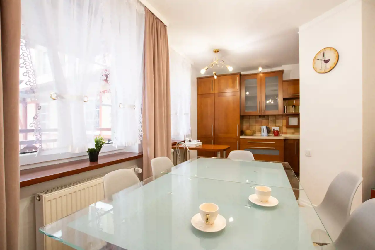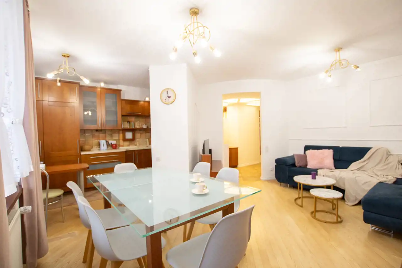 -Pokój 1: kanapa, stół z krzesłami, komoda; połączony z kuchnią
