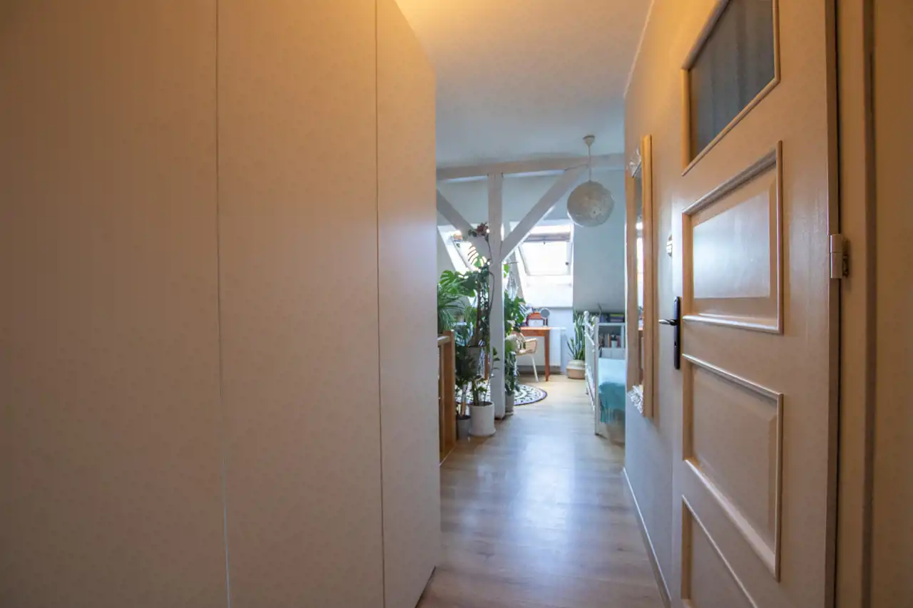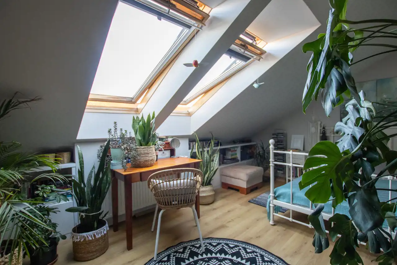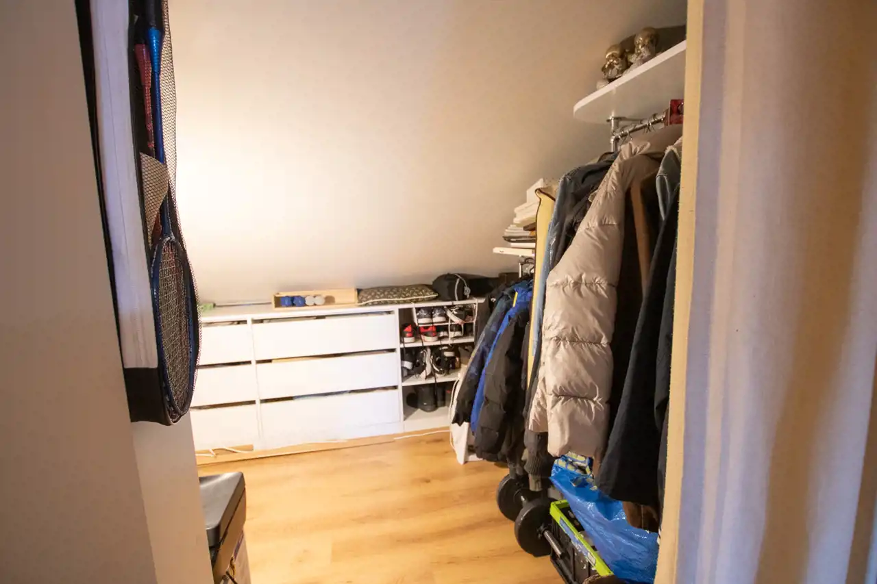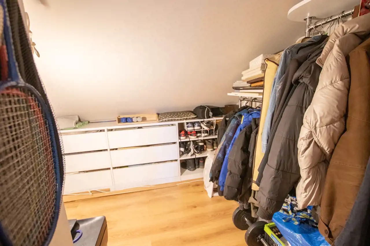 - Na poddaszu znajduje się garderoba, która zapewnia dodatkową, praktyczną przestrzeń do przechowywania.