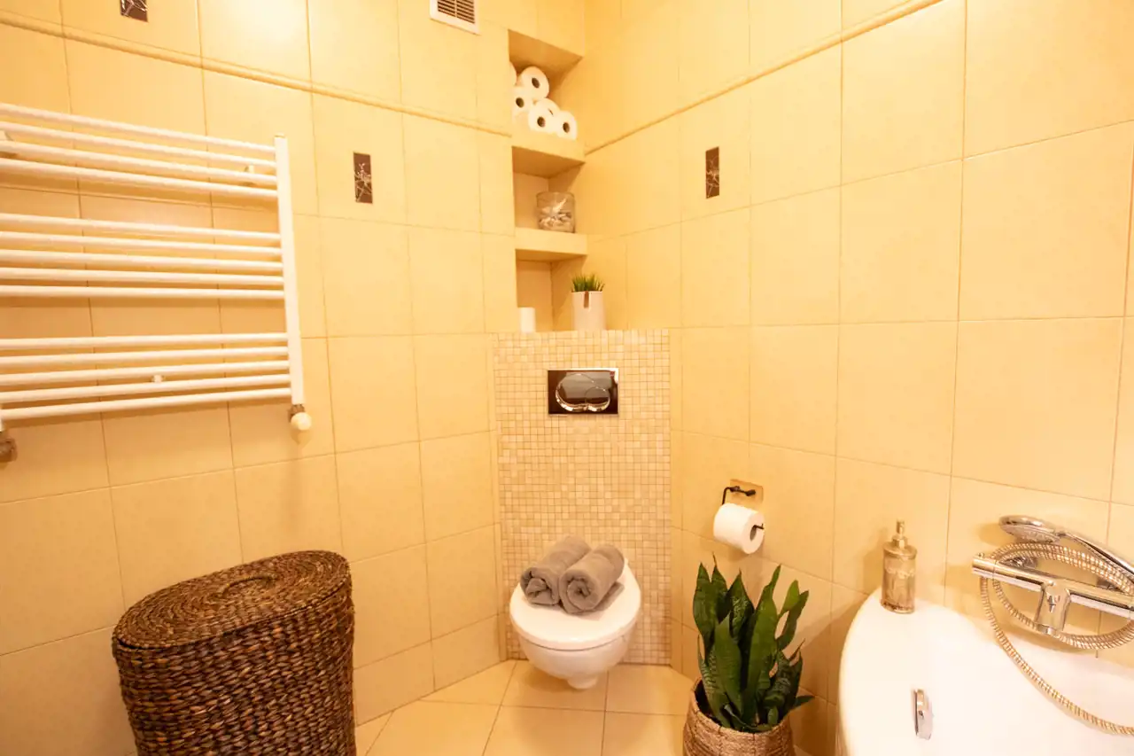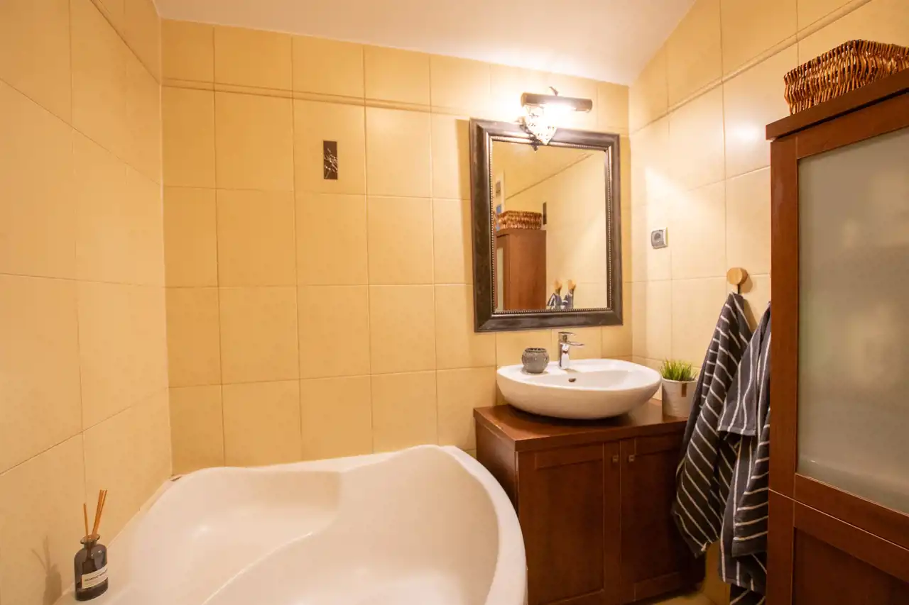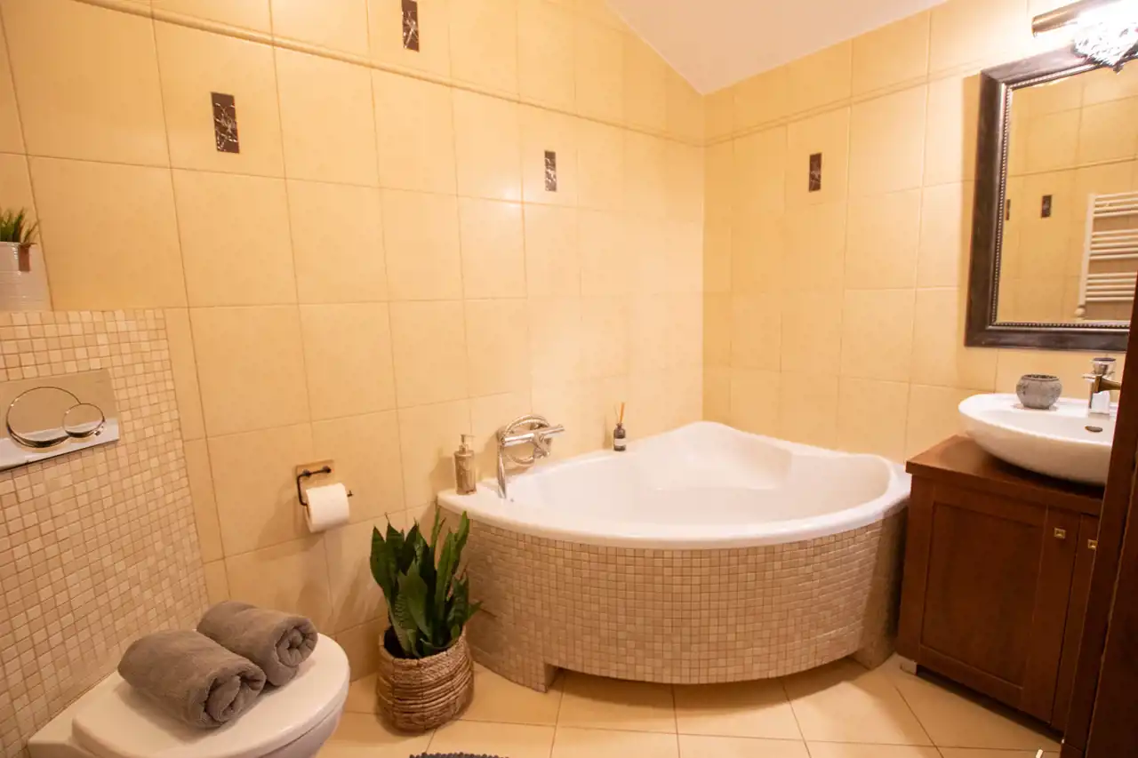 - Łazienka: Narożna wanna, umywalka z miejscem do przechowywania, wc
