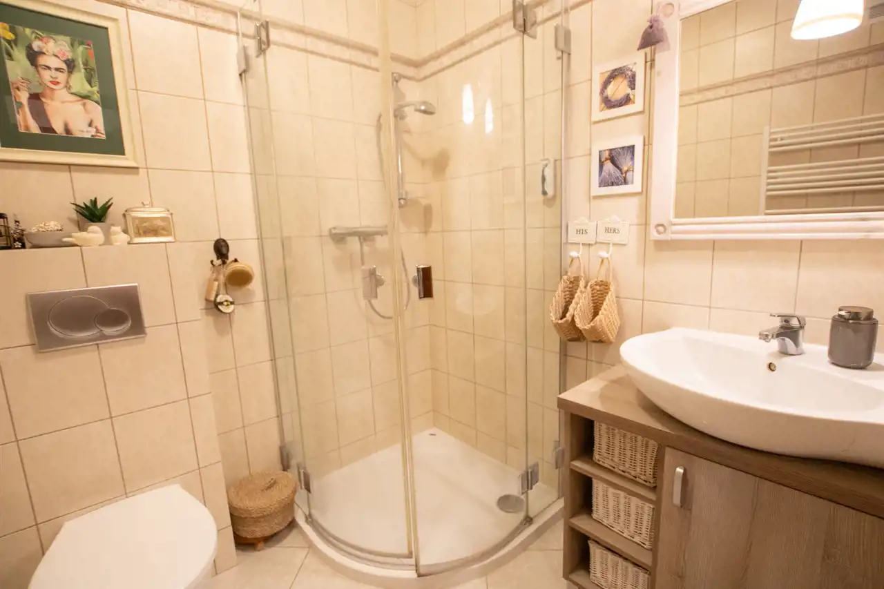 - Łazienka : Kabina prysznicowa, umywalka z miejscem do przechowywania, wc