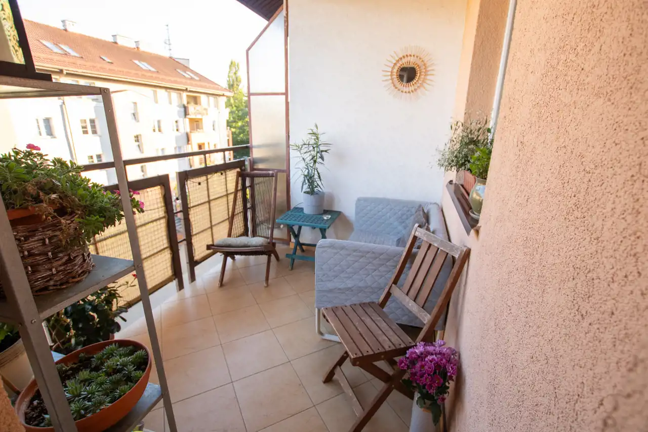- Salon z aneksem kuchennym : Zabudowa meblowa, zmywarka, kuchenka z okapem oraz sofa. Atutem salonu jest bezpośrednie wyjście na duży balkon, który stanowi dodatkową przestrzeń do wypoczynku.