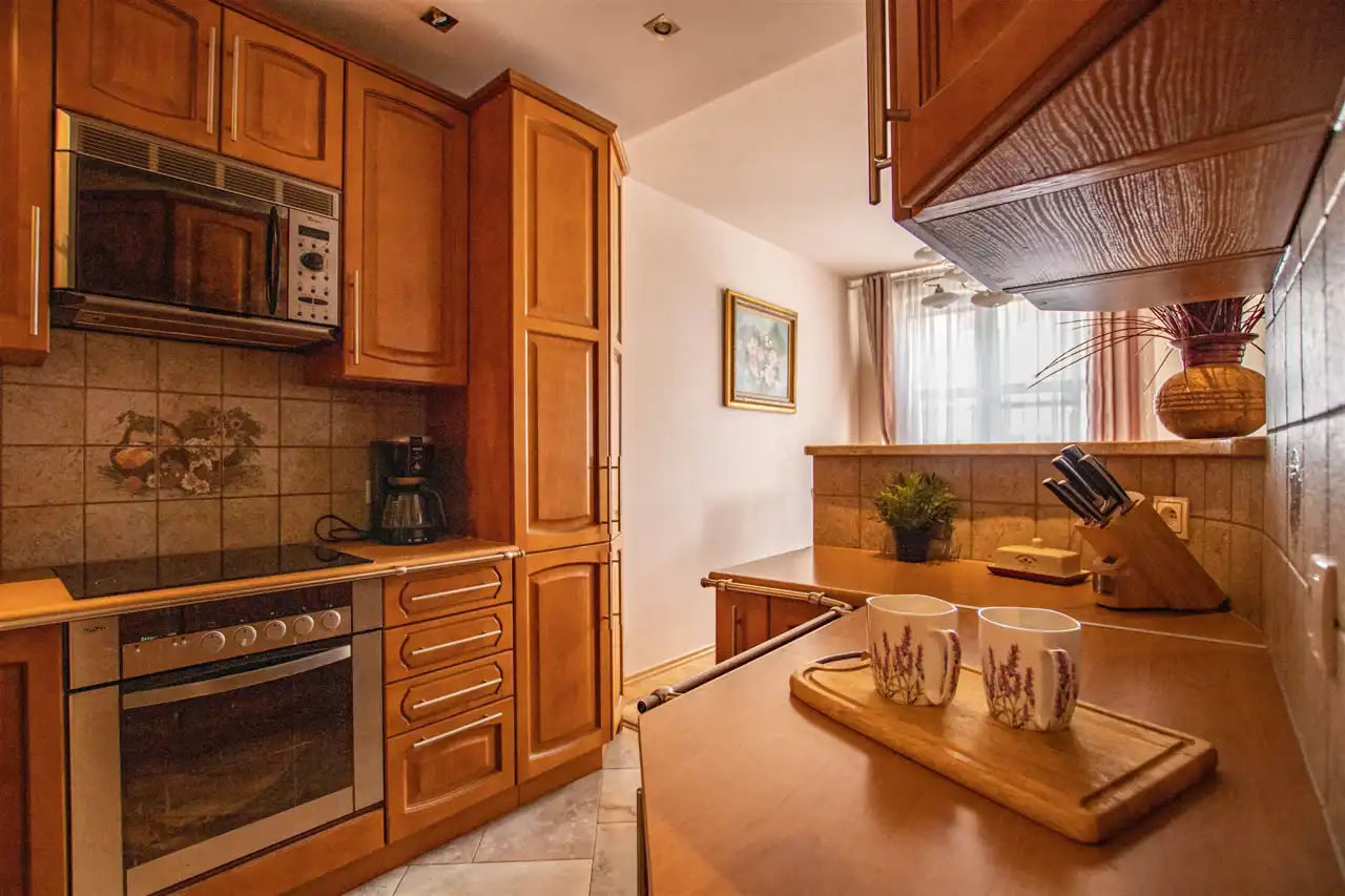 Kuchnia: cała w zabudowie, połączona z jadalnią