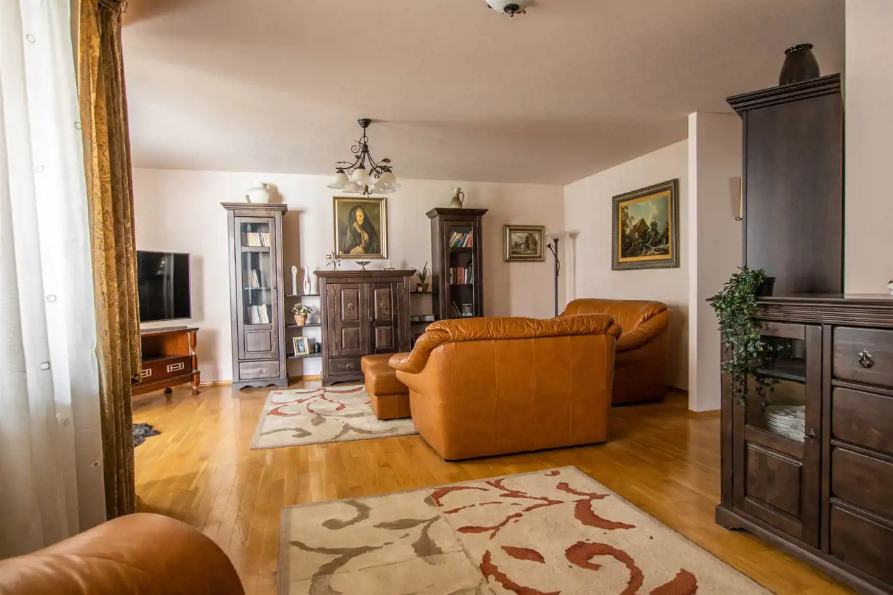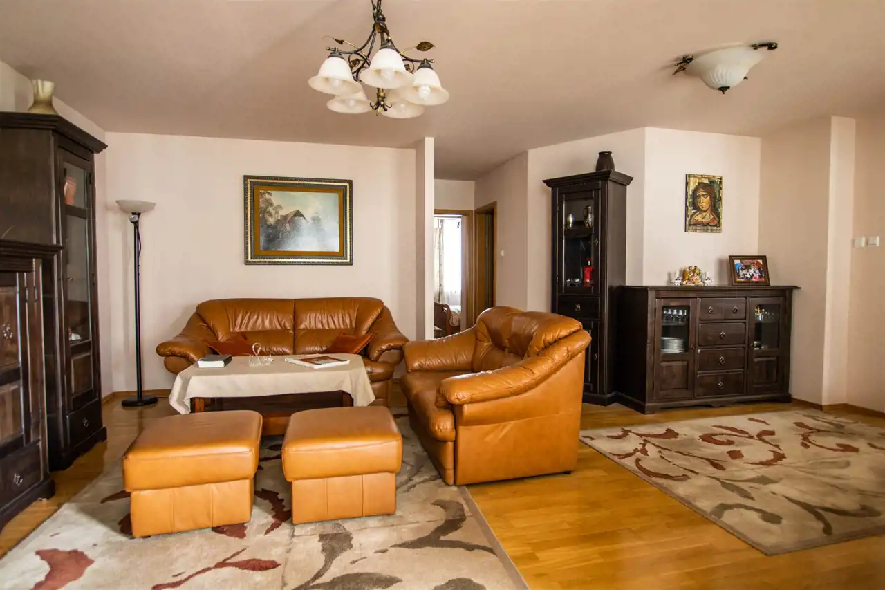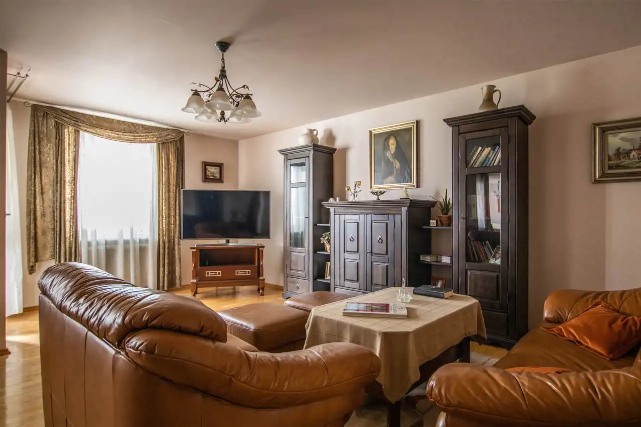 Salon: przestronny z dużymi oknami, skórzanymi kanapami