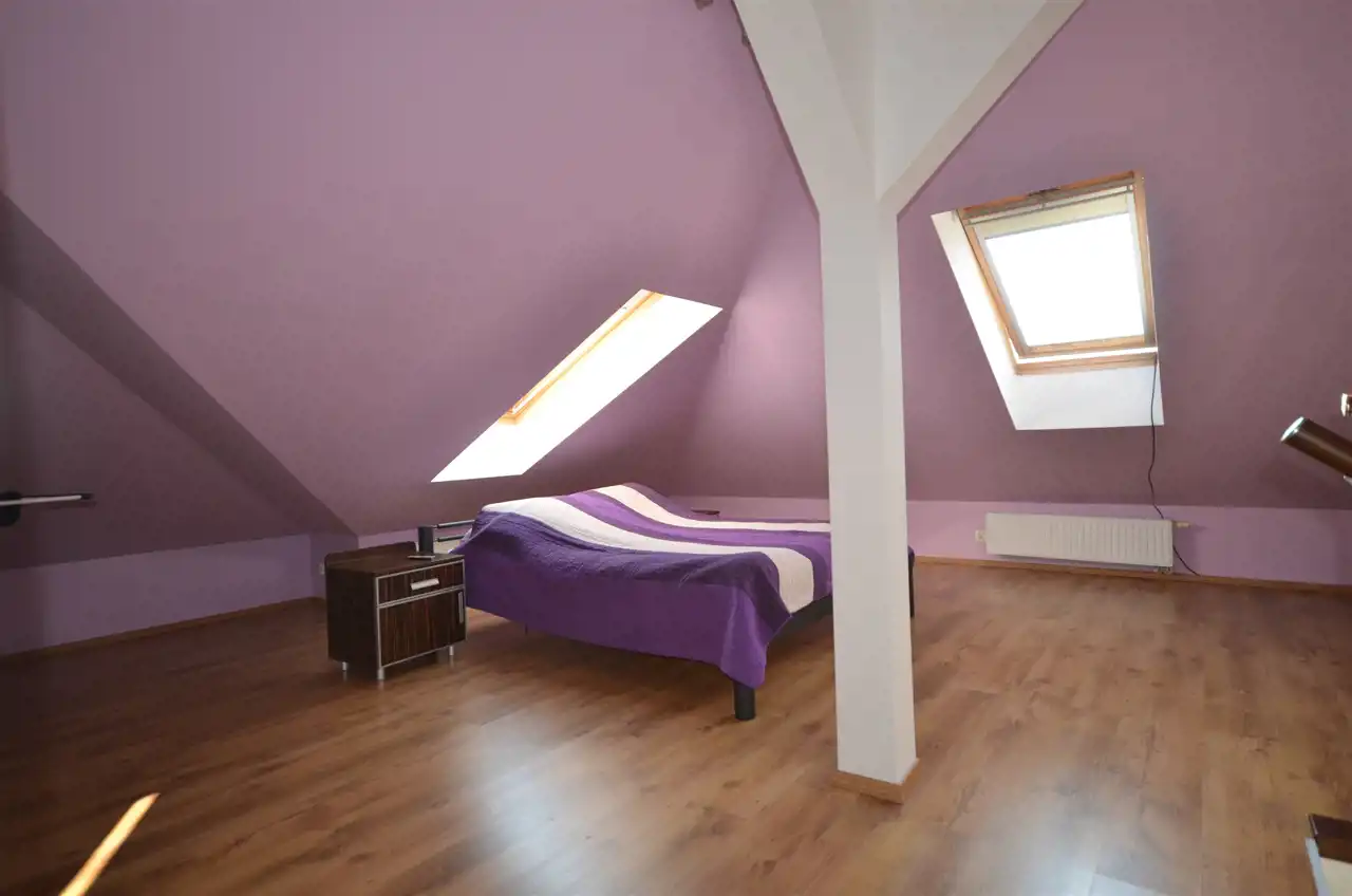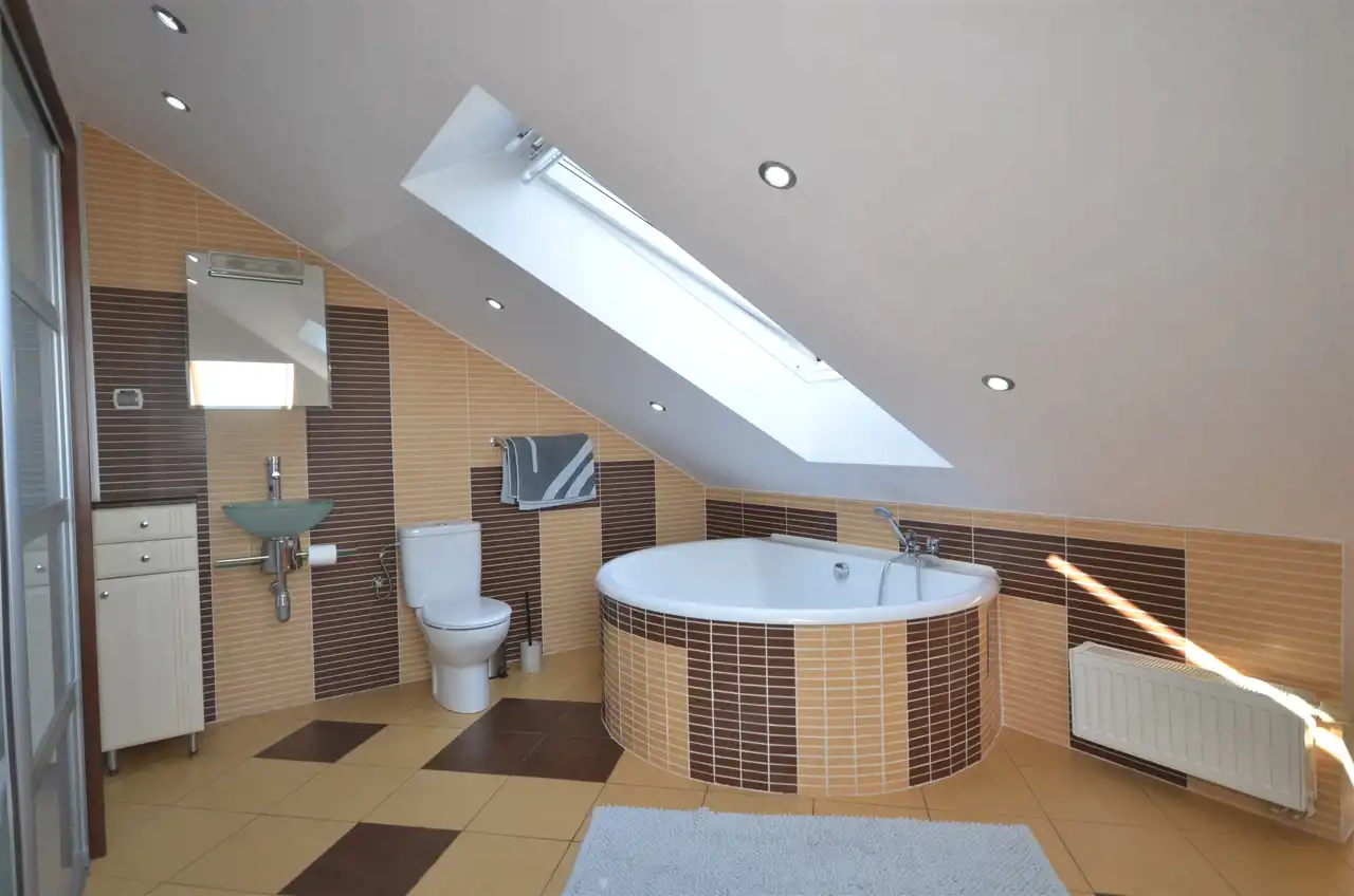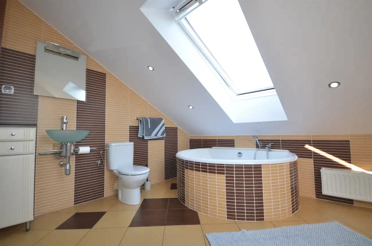 Łazienki oferują pełen komfort – jedna wyposażona w prysznic typu walk-in, druga w dużą, narożną wannę pod oknem dachowym, dzięki czemu wnętrze wypełnia naturalne światło. Uzupełnieniem jest dodatkowa toaleta, podnosząca wygodę codziennego użytkowania.