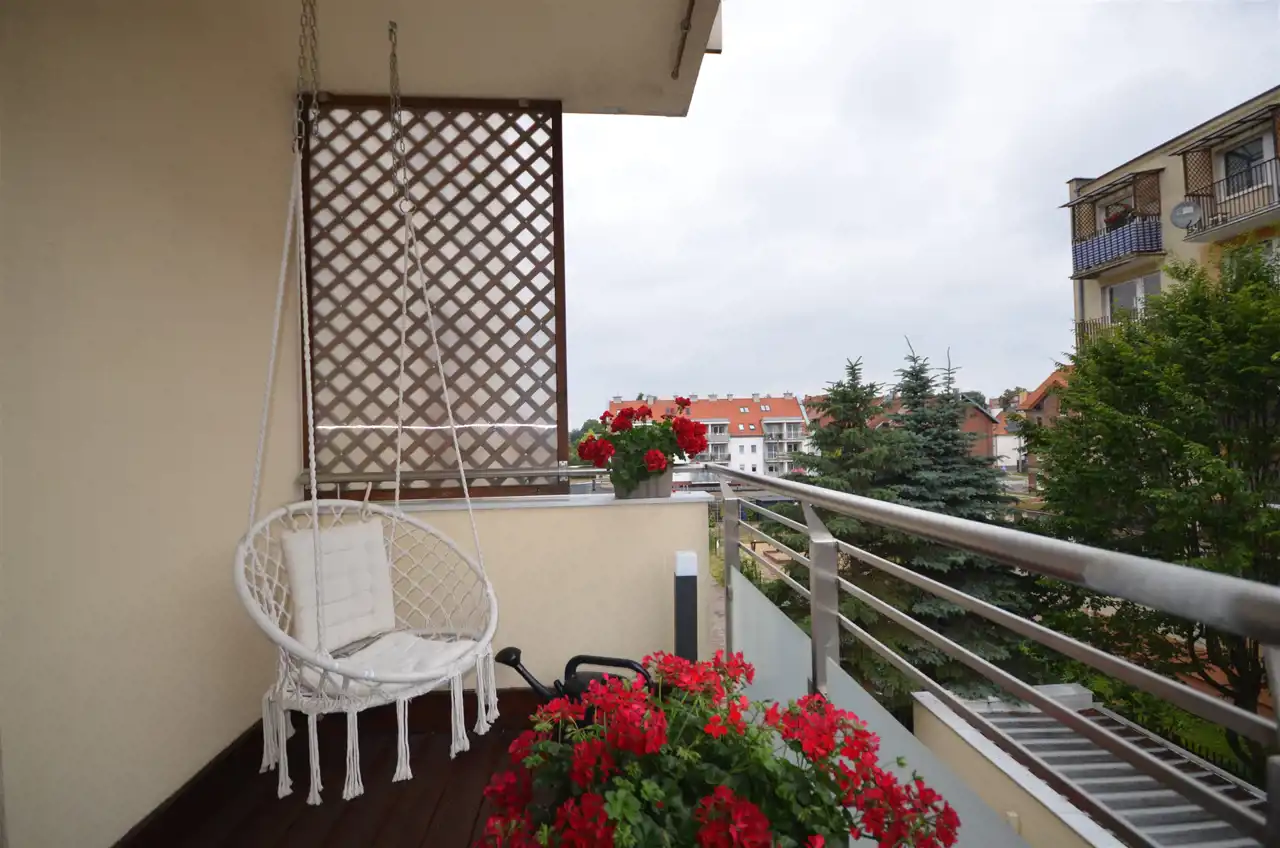 Dodatkowym atutem są dwa balkony – w tym jeden z fotelem wiszącym, który doskonale sprawdzi się zarówno na poranną kawę, jak i wieczorny odpoczynek z książką.