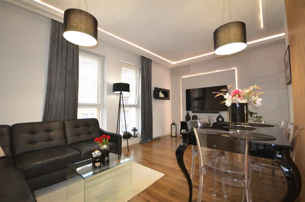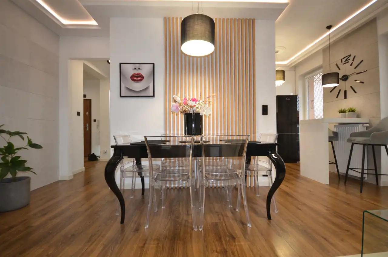 Kuchnia, oprócz funkcjonalnych rozwiązań, przyciąga wzrok stylowymi lakierowanymi frontami i czarnymi akcentami, które idealnie wpisują się w aktualne trendy. Z kolei łazienka oferuje wysoki komfort użytkowania – znajdziesz tu duże lustro z podświetleniem LED, podwieszaną szafkę oraz nowoczesną armaturę.