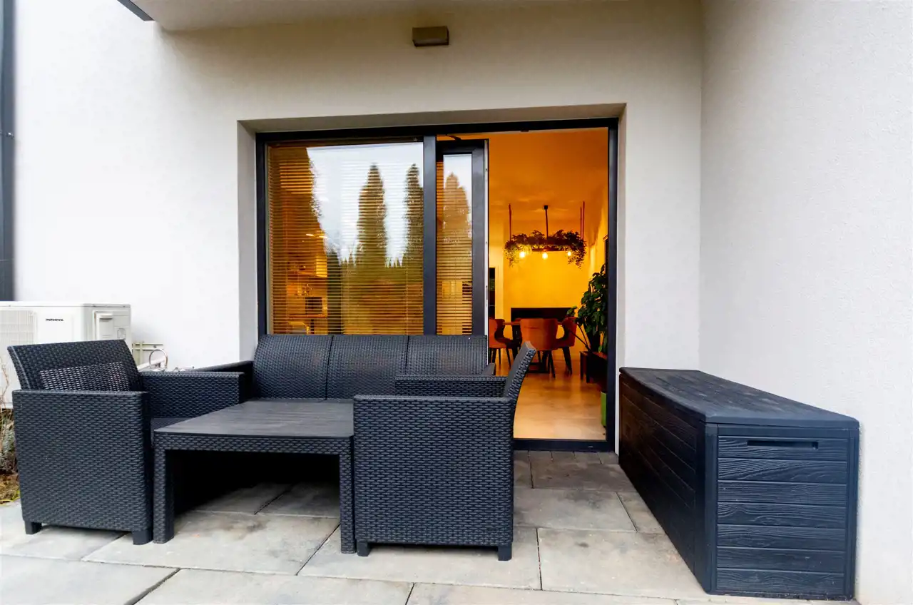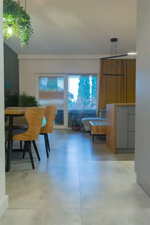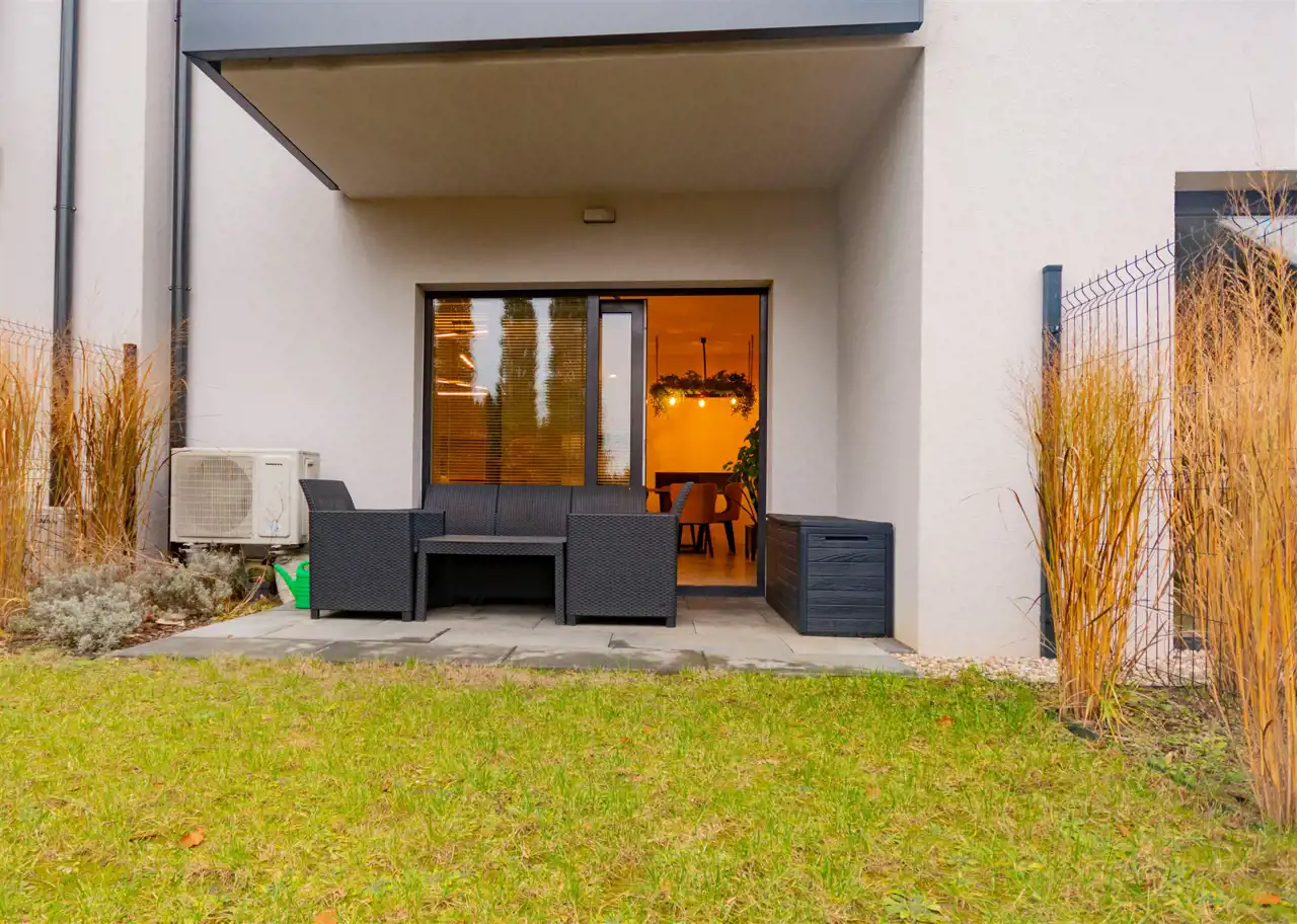 - Salony z aneksem kuchennym wyjściem na taras i ogród , pozostający do wyłącznej dyspozycji właściciela lokalu