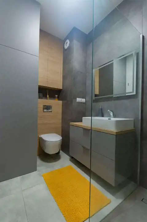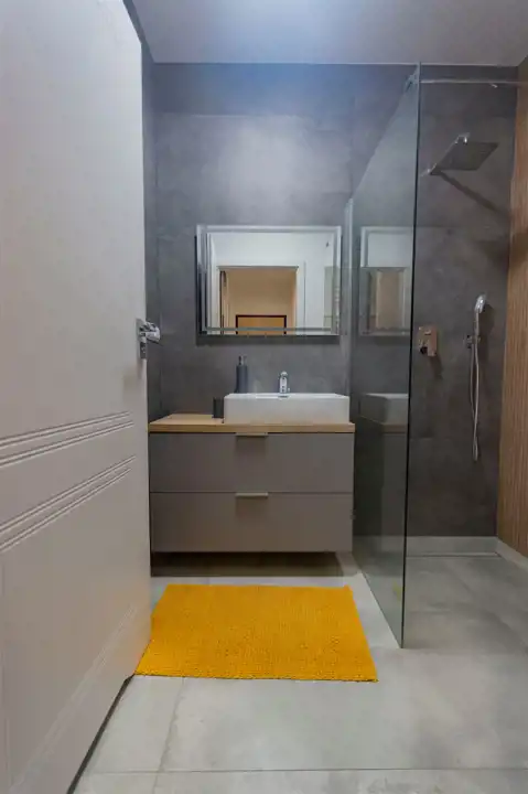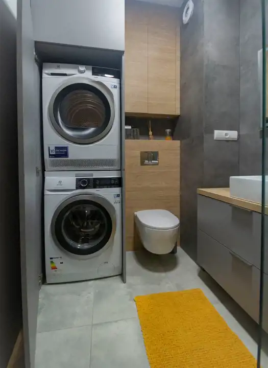 - Łazienki z wc , w której zamontowano prysznic z odpływem liniowym oraz zabudowę , pralki i suszarki.