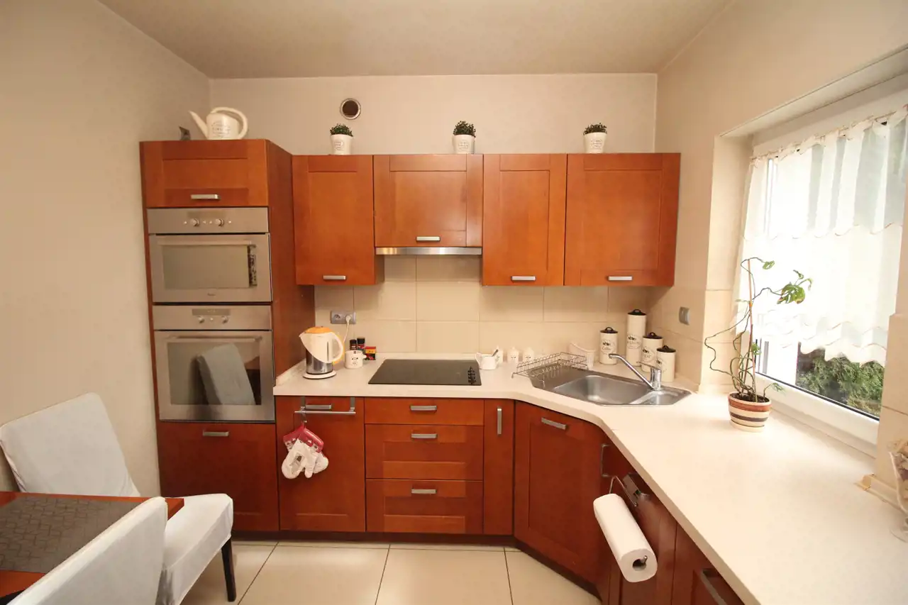 Cena zawiera zabudowę stałą tj. meble kuchenne na wymiar wraz ze sprzętem AGD oraz zabudowę garderobianą w wiatrołapie. W przedpokoju na poddaszu zamontowano właz z dostępem do pomieszczenia strychowego pełniącego funkcję przechowywania.