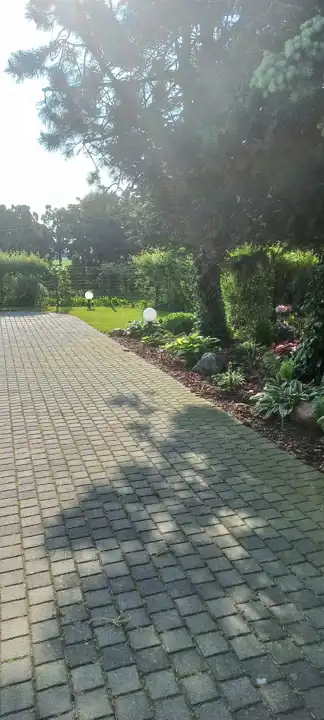 Działka ogrodzona i zagospodarowana, częściowo utwardzona kostką brukową.