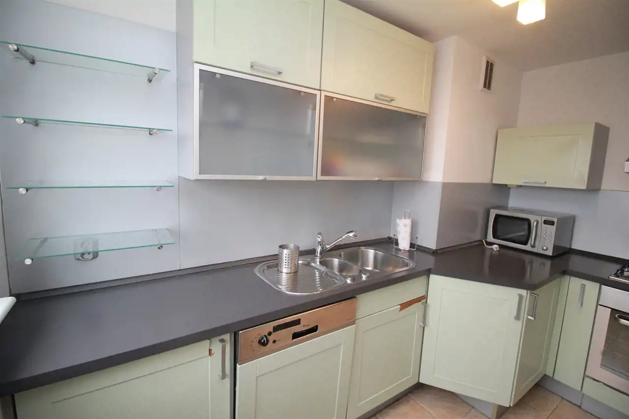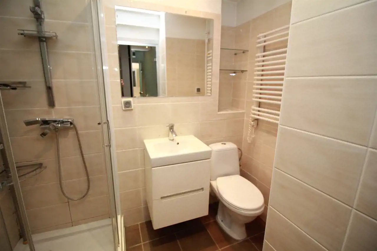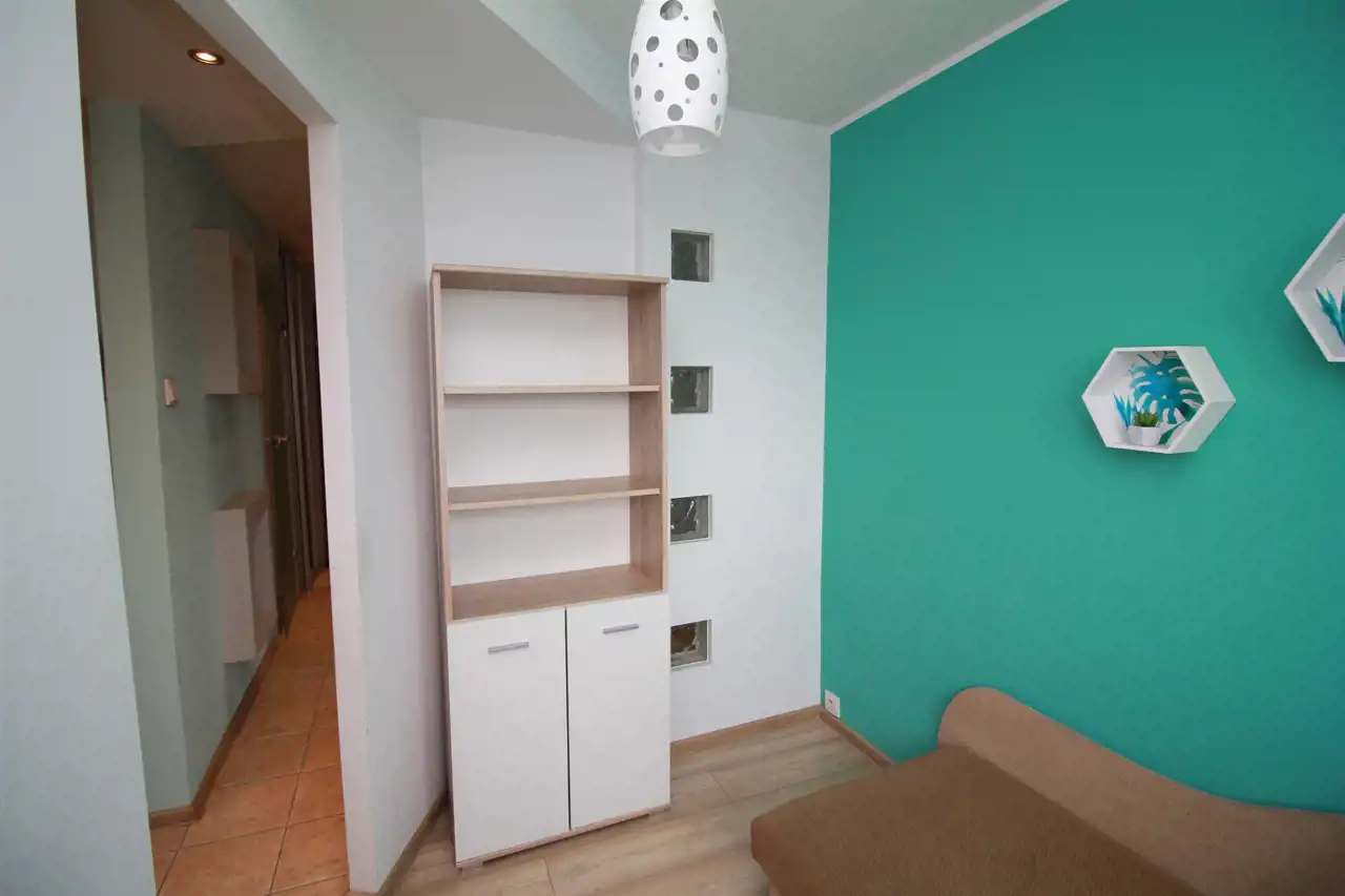 Okna PCV wyposażone w roletki wewnętrzne "dzień - noc", na podłogach znajdują się panele oraz płytki. Łazienka wykończona w glazurze nowego typu i wyposażona w kabinę prysznicową. Łazienka z meblami w zabudowie oraz sprzęt AGD typu: zmywarka, płyta gazowa z piekarnikiem elektrycznym, lodówka. Przedpokój oraz sypialnia posiadają funkcjonalne szafy garderobiane w zabudowie.