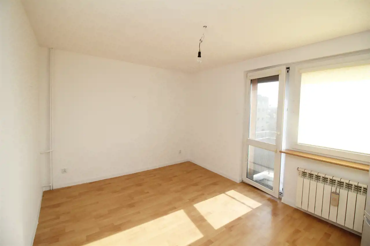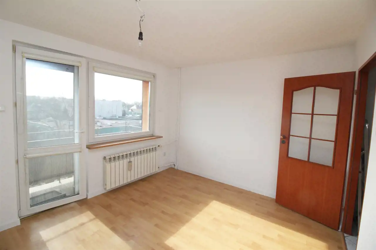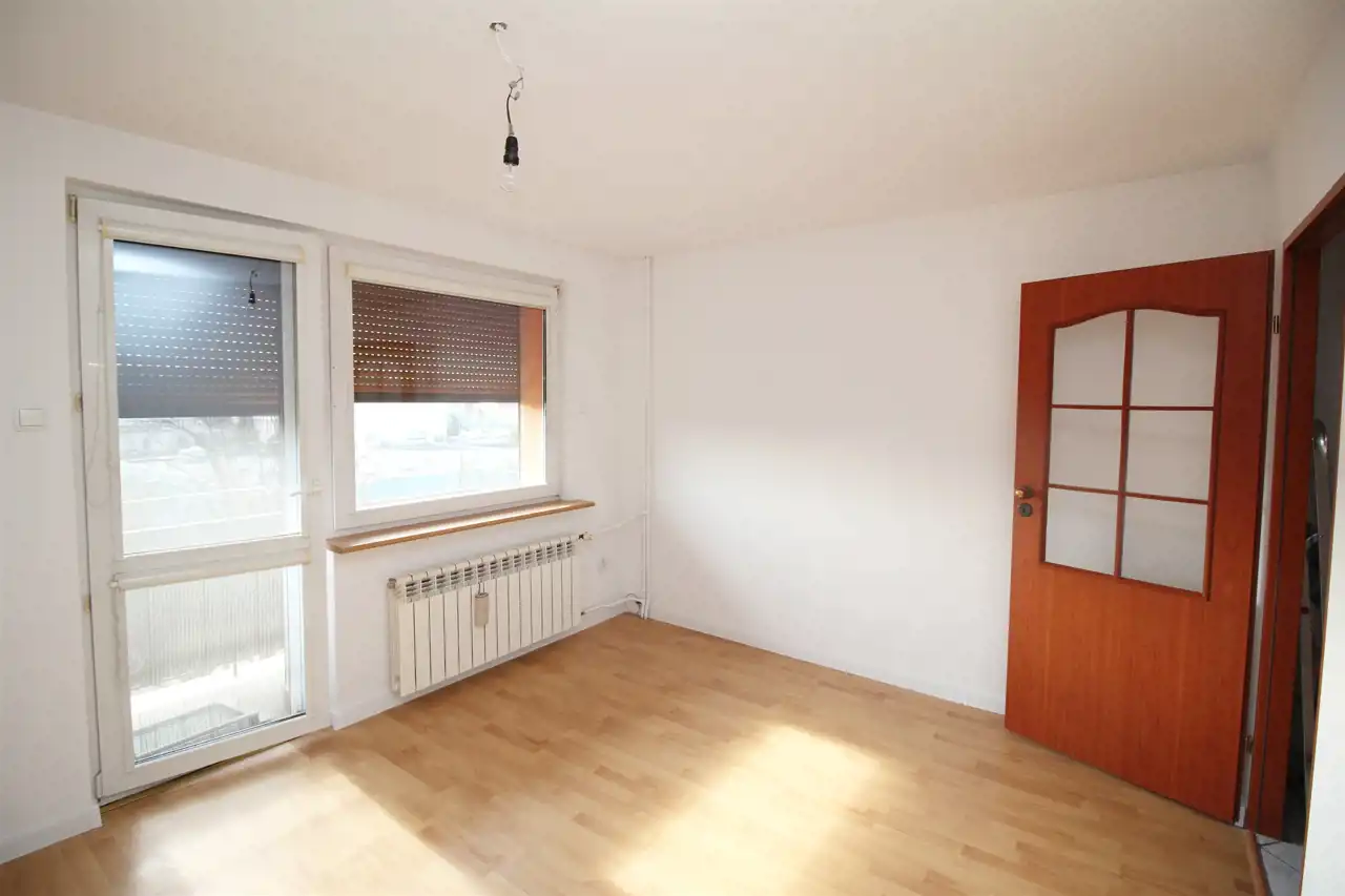 Okna PCV z roletkami wewnętrznymi oraz okno balkonowe wyposażone jest w roletą zewnętrzną zasilaną elektrycznie. Na podłogach znajdują się panele oraz mozaika drewniana.