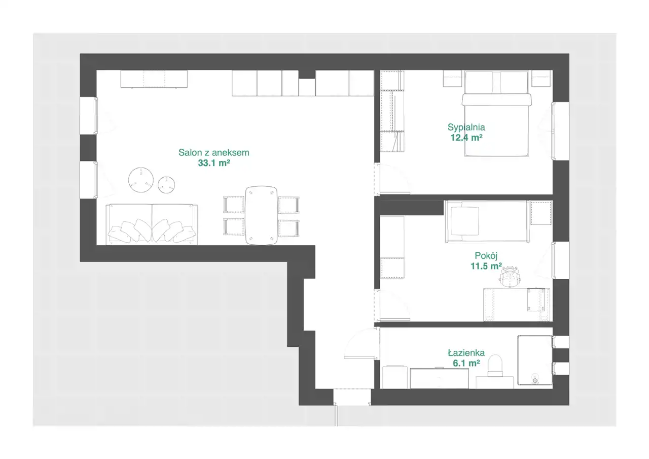 - Układ: rozkładowe, jednopoziomowe – 2 sypialnie + salon z aneksem
