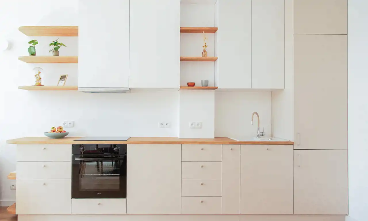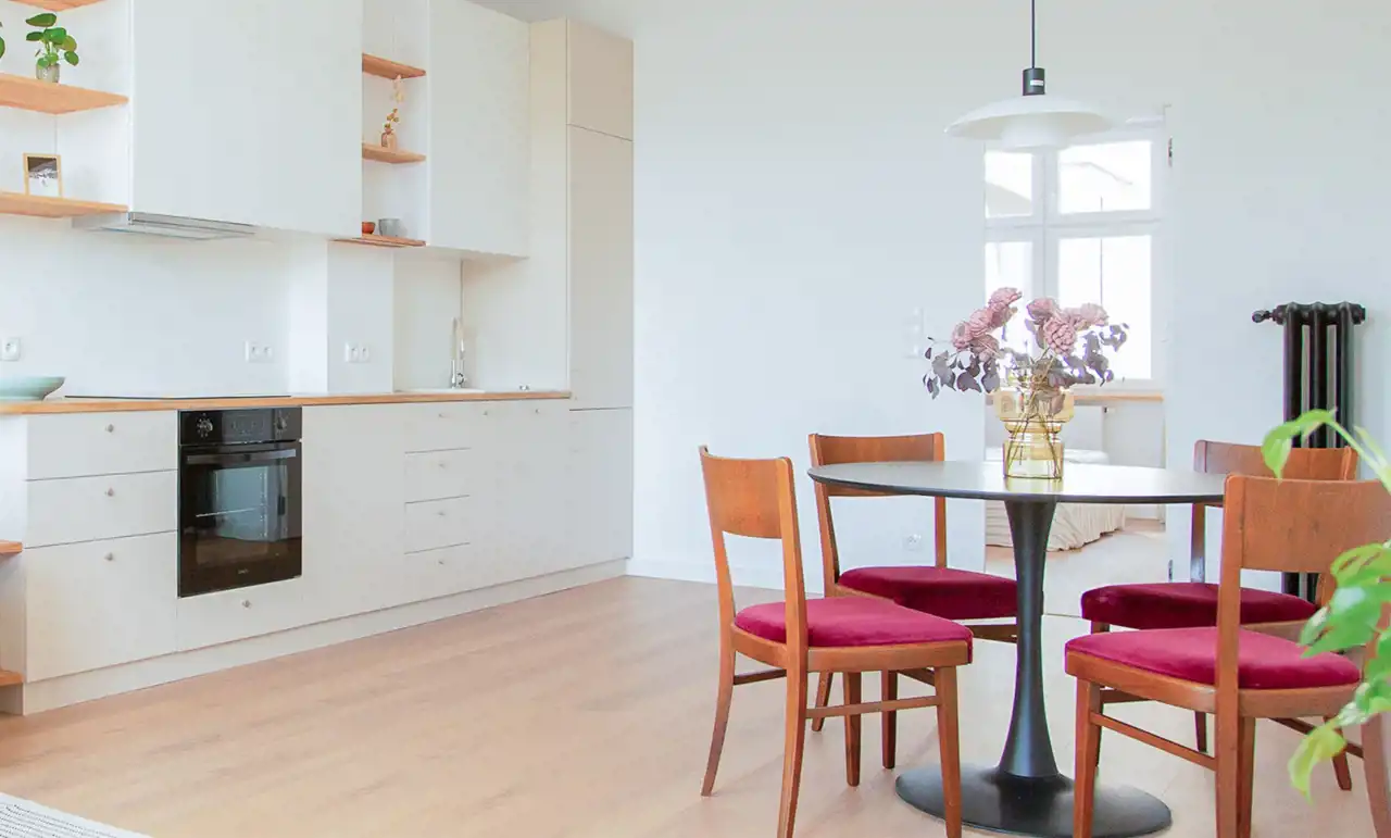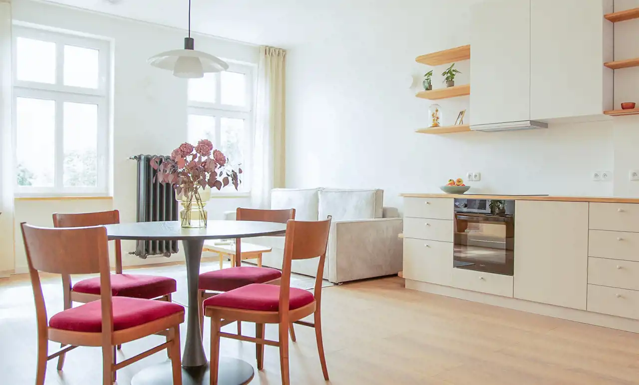 Wnętrze wykończone z dbałością o każdy detal – jasne, przestronne i dobrze doświetlone. Sufity o wysokości 290 cm potęgują wrażenie przestrzeni, a naturalne materiały – lite drewno dębowe i zabudowy na wymiar – nadają wnętrzu wyjątkowy, przytulny charakter. Kuchnia została zaprojektowana z myślą o funkcjonalności, a wysokiej jakości panele i stolarka okienna zapewniają trwałość i komfort użytkowania.