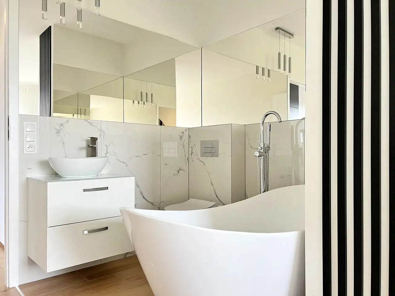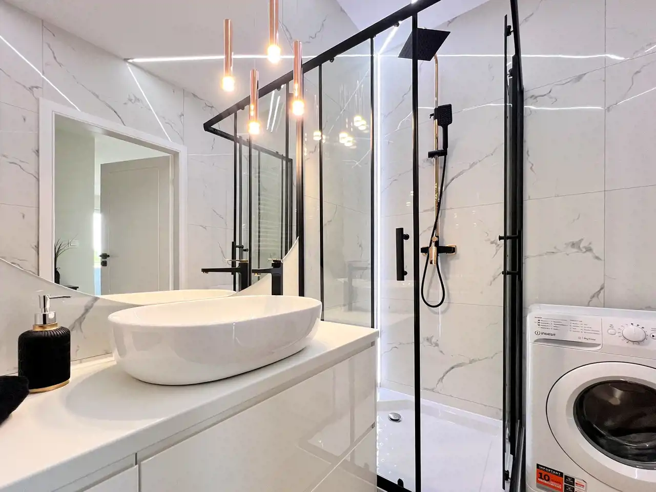 - nowoczesną łazienkę z prysznicem, pralką i zabudową,