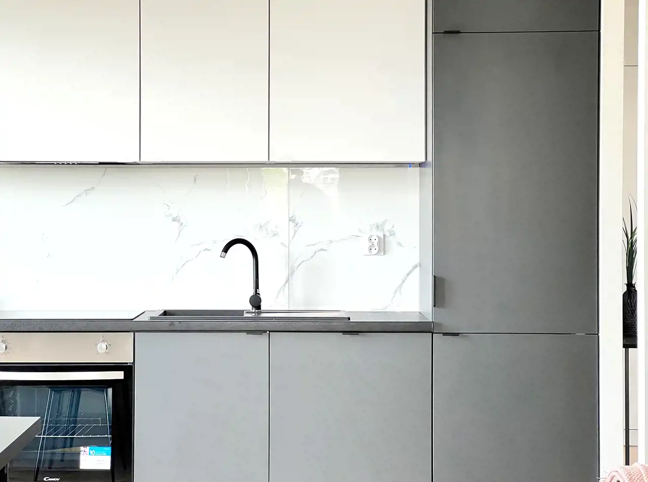 - kuchnię z meblami na wymiar i kompletnym AGD (lodówka, zmywarka, piekarnik, płyta indukcyjna),