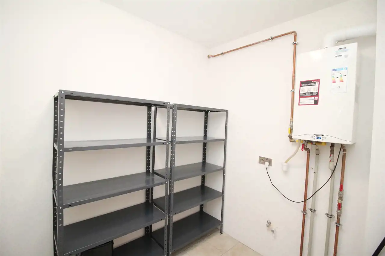 Obszerne pomieszczenie gospodarcze służy jako strefa techniczna i doskonałe miejsce do przechowywania wyposażone w regały.