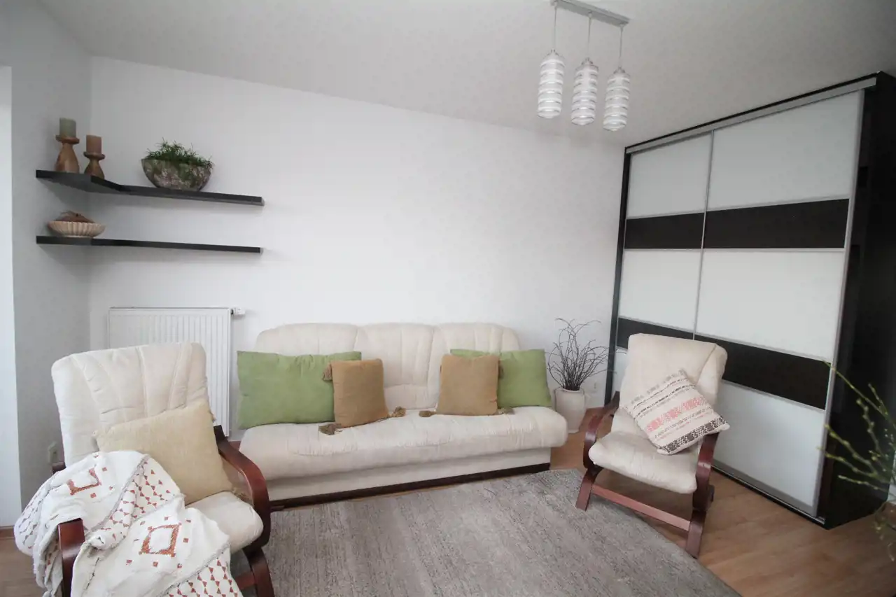 W salonie znajduje się pojemna szafa garderobiana w zabudowie oraz komplet wypoczynkowy.