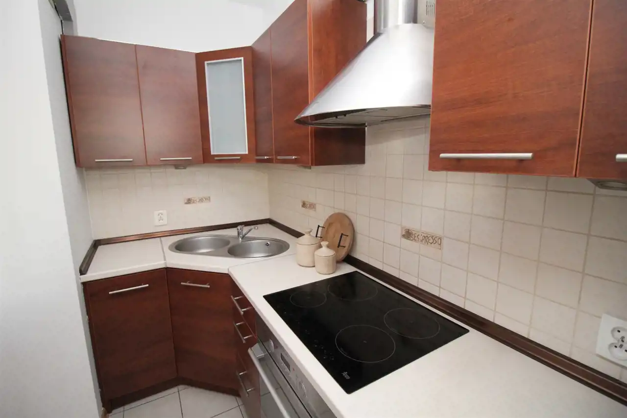 Kuchnia z umeblowana meblami w zabudowie i wyposażona w sprzęt AGD typu: płyta indukcyjna, piekarnik, okap oraz lodówka.