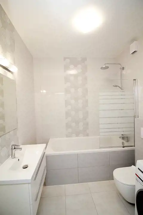 Łazienka wykończona nowoczesną glazurą oraz wyposażona w wannę z możliwością prysznica. Dodatkowo w łazience zainstalowano umywalkę z lustrem i grzejnik drabinkowy oraz pralko-suszarkę + ogrzewanie podłogowe. W całym mieszkaniu zainstalowano energooszczędne oświetlenie ledowe.