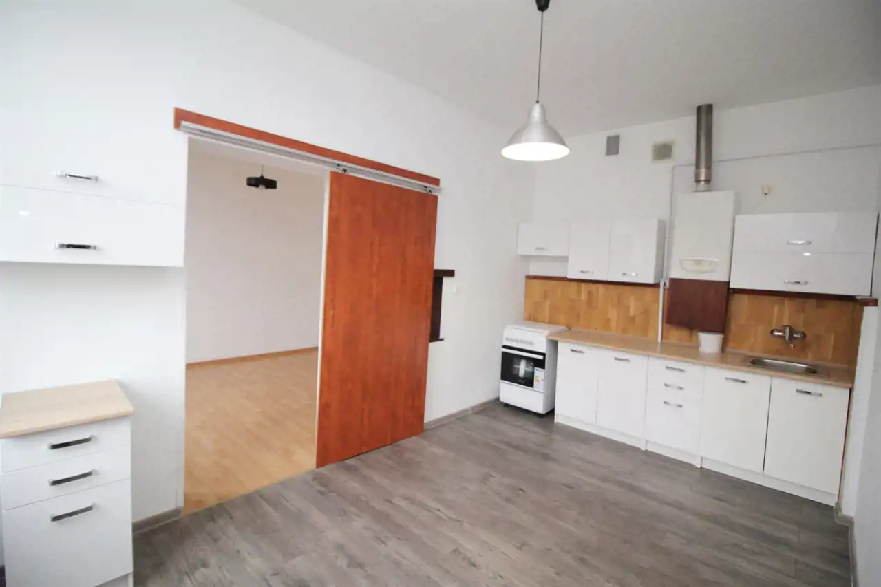 - 1 pokoju, obszernej kuchni, łazienki oraz przedpokoju.
