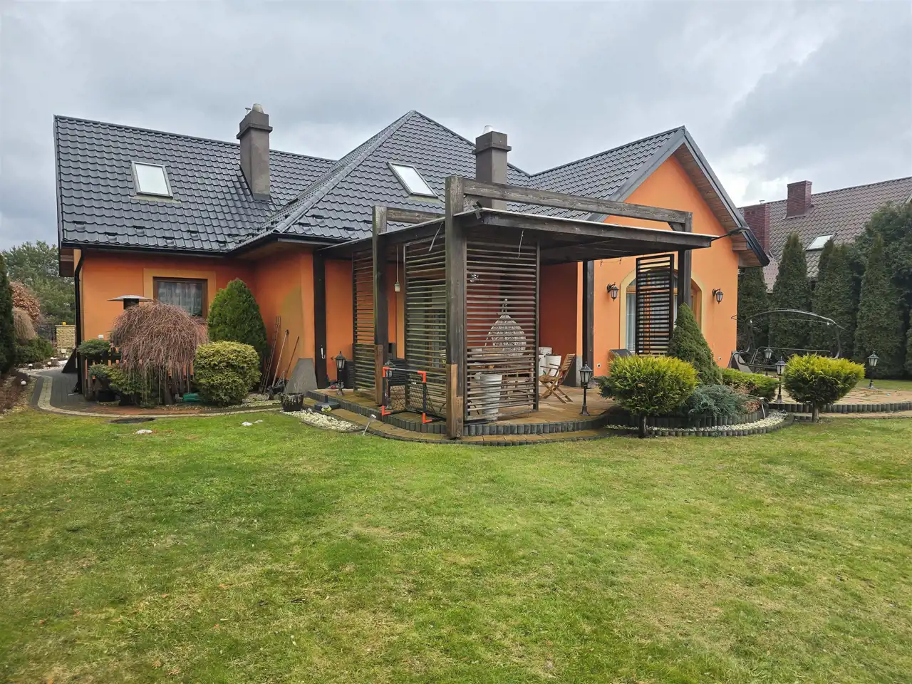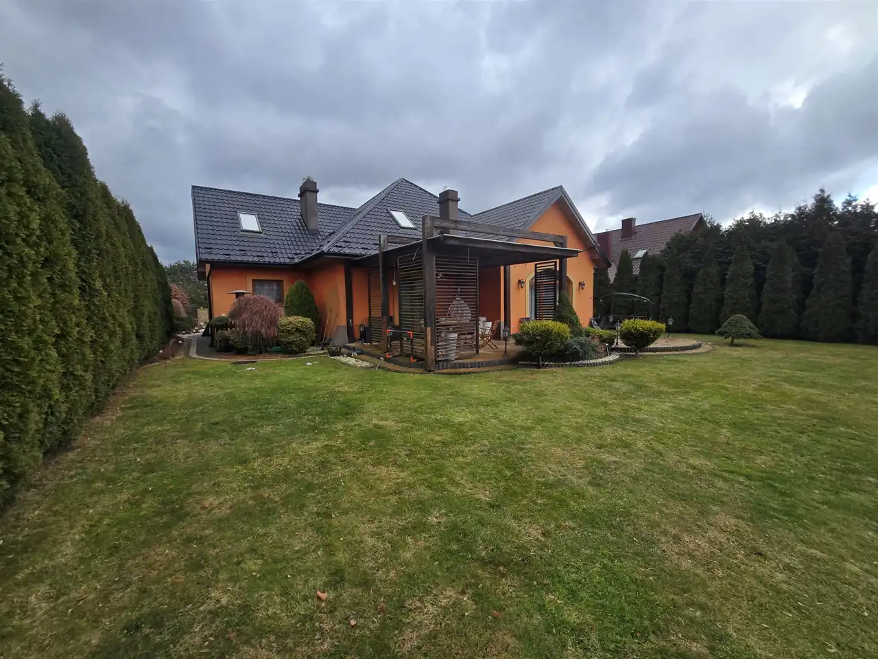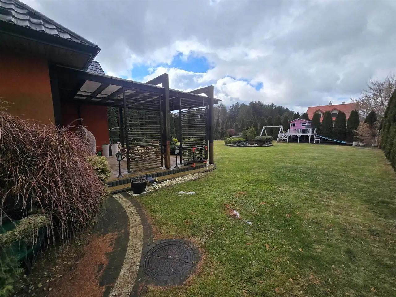 Dom częściowo podpiwniczony, garaż w bryle budynku, za domem duży taras z widokiem na obszerny ogród z zabudową do zabaw dla dzieci.