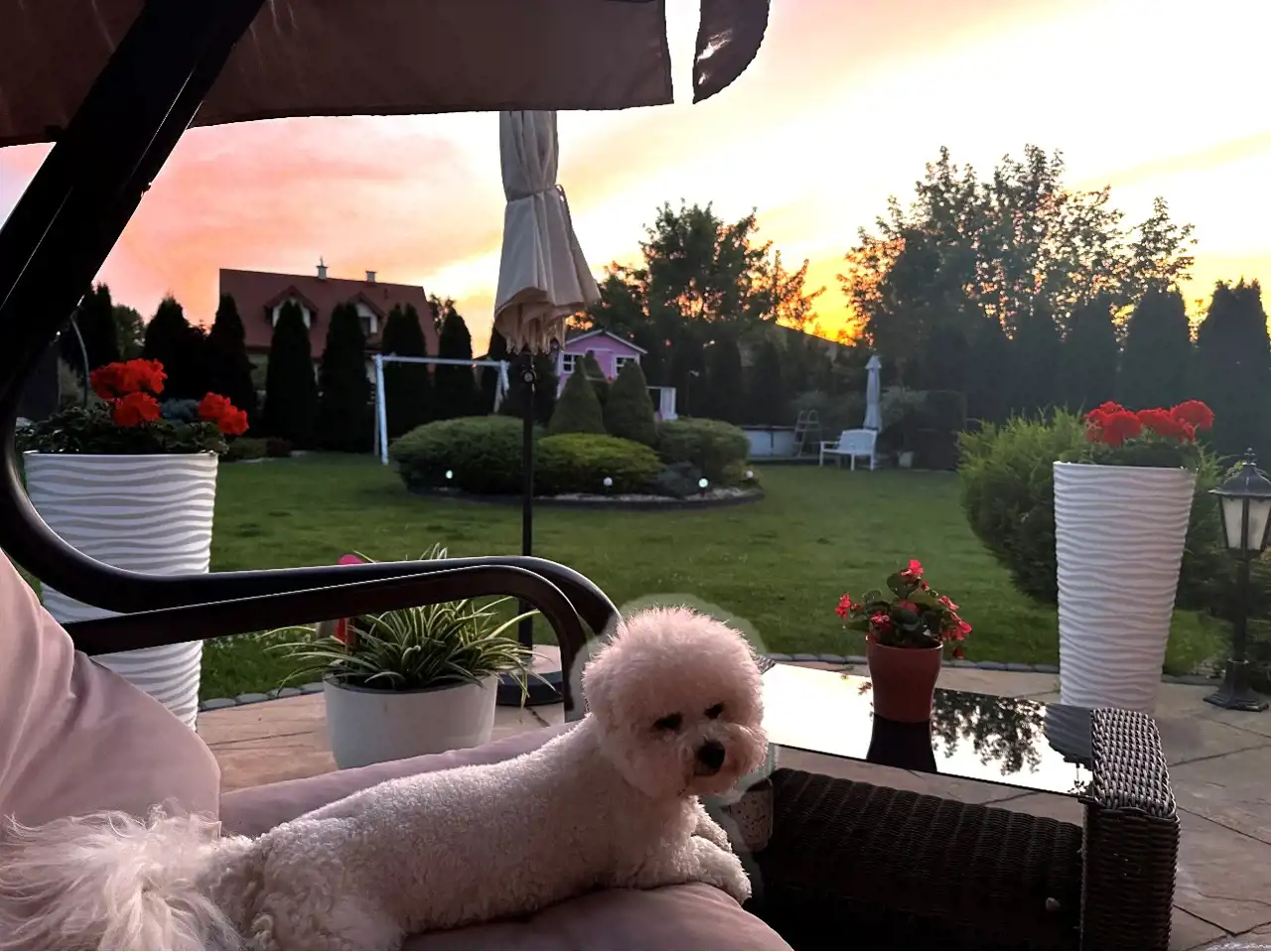 Dom częściowo podpiwniczony, garaż w bryle budynku, za domem duży taras z widokiem na obszerny ogród z zabudową do zabaw dla dzieci.