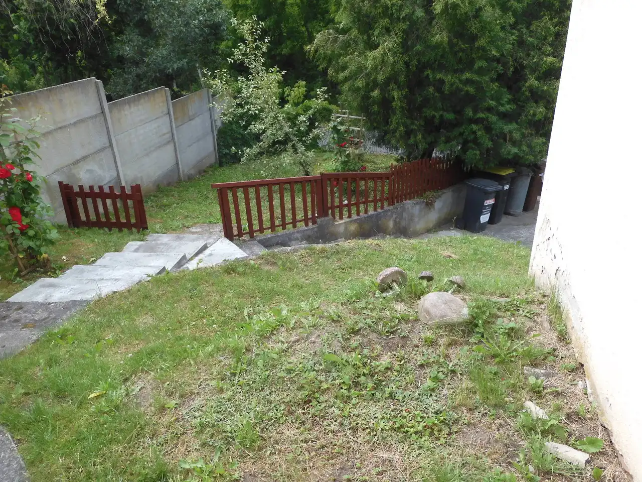 Działka kształt trapezu pochyła, dom posadowiony w górnej, płaskiej części działki. Od ulicy grodzą go budynki gospodarcze, przez co cicho i spokojnie, nie słychać ruchu ulicznego.