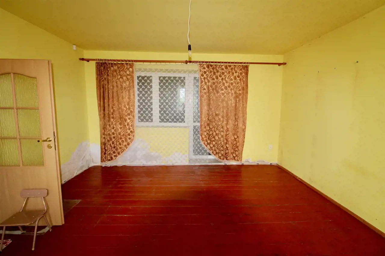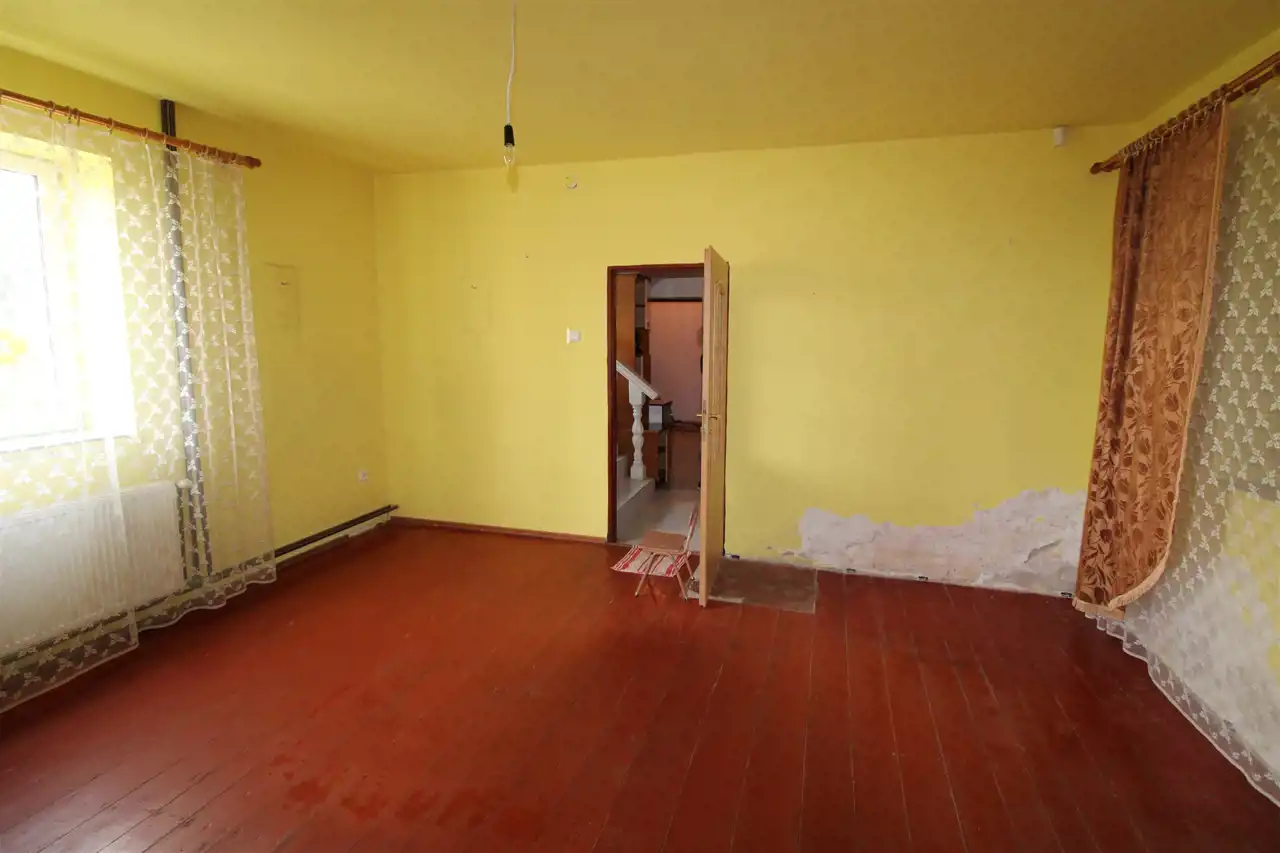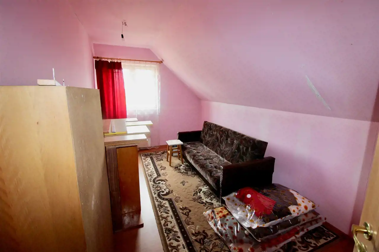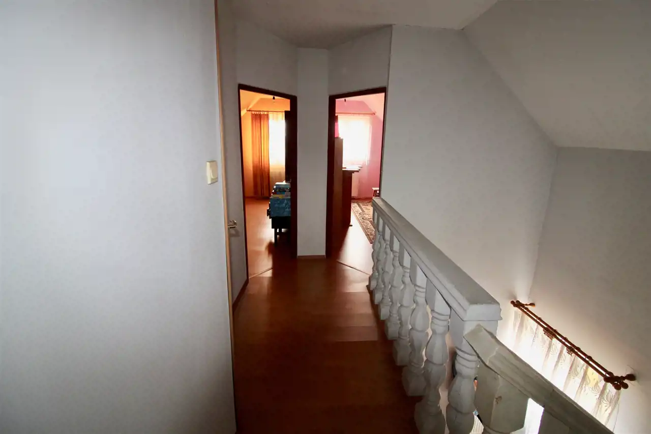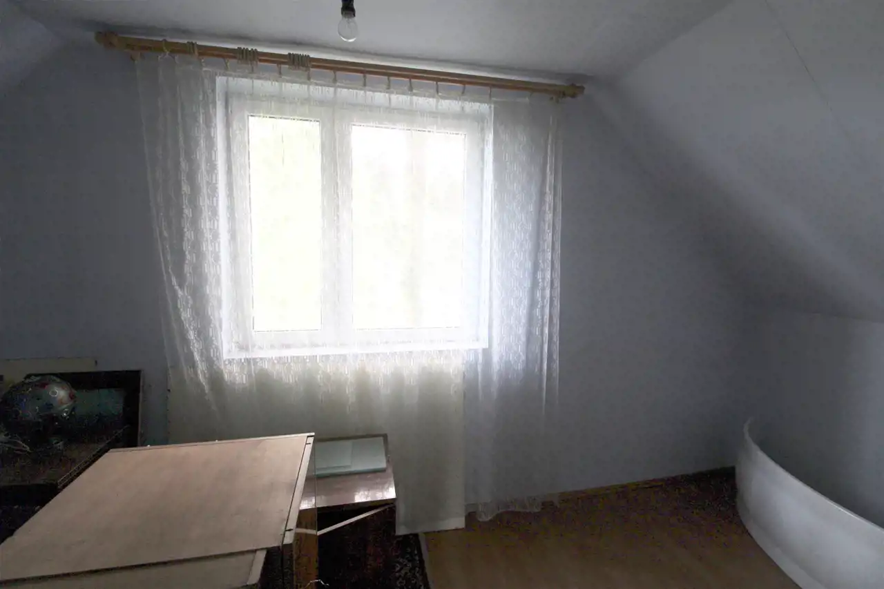 Na parterze budynku znajduje się duży pokój, kuchnia, łazienka, przedpokój i ganek.