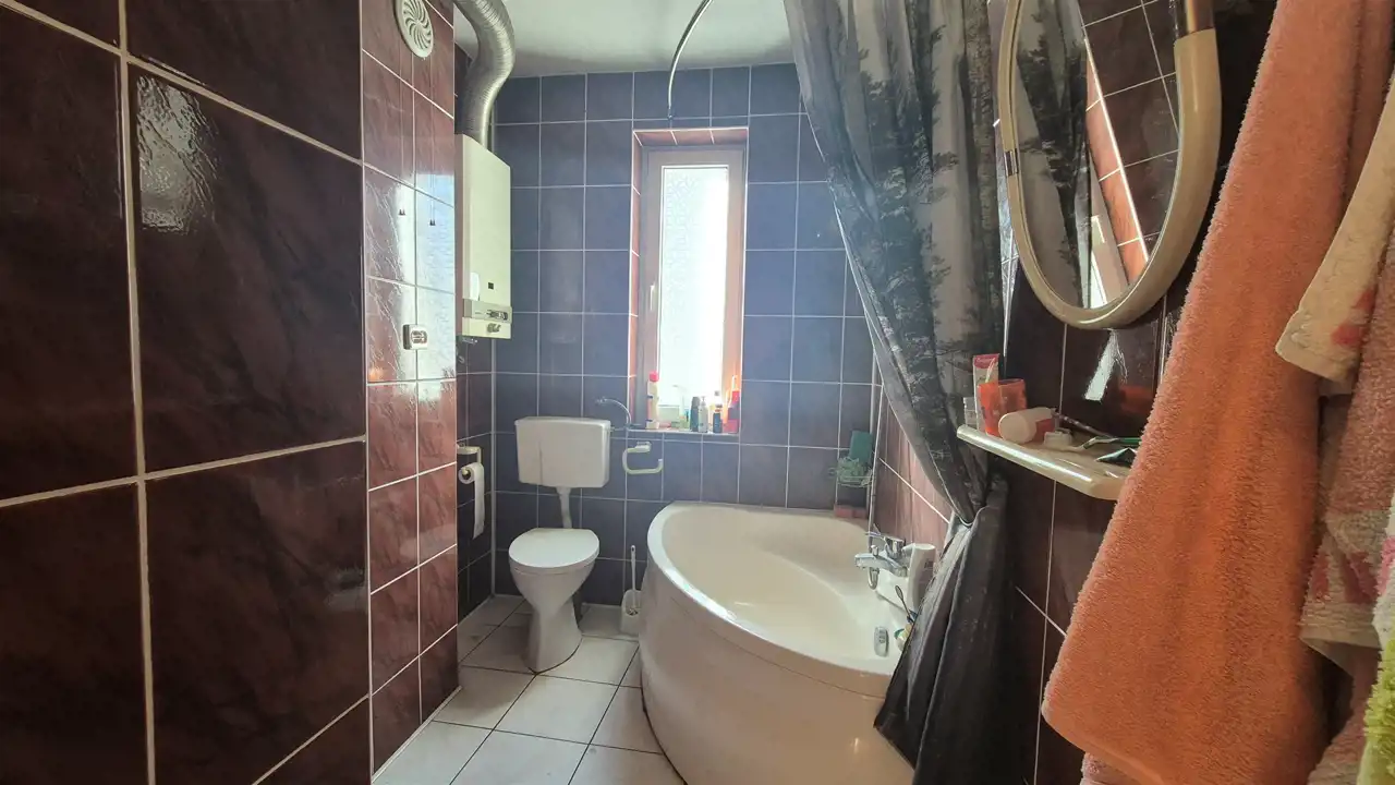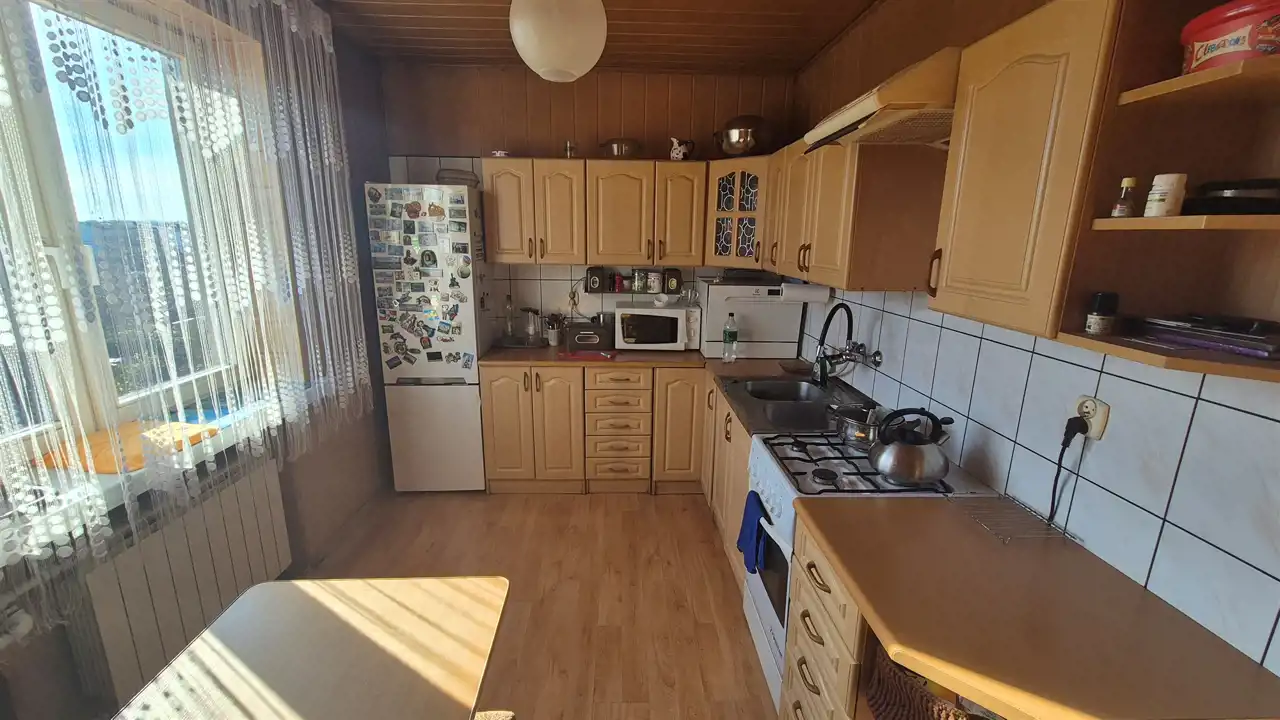 Na parterze są 3 pokoje i łazienka z WC a na piętrze 2 pokoje, kuchnia i łazienka.