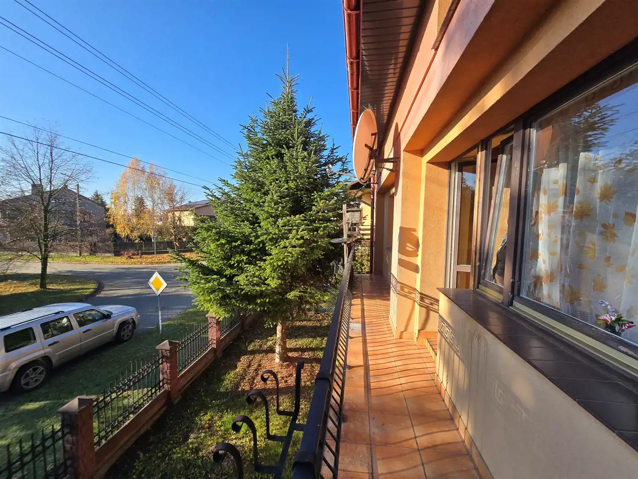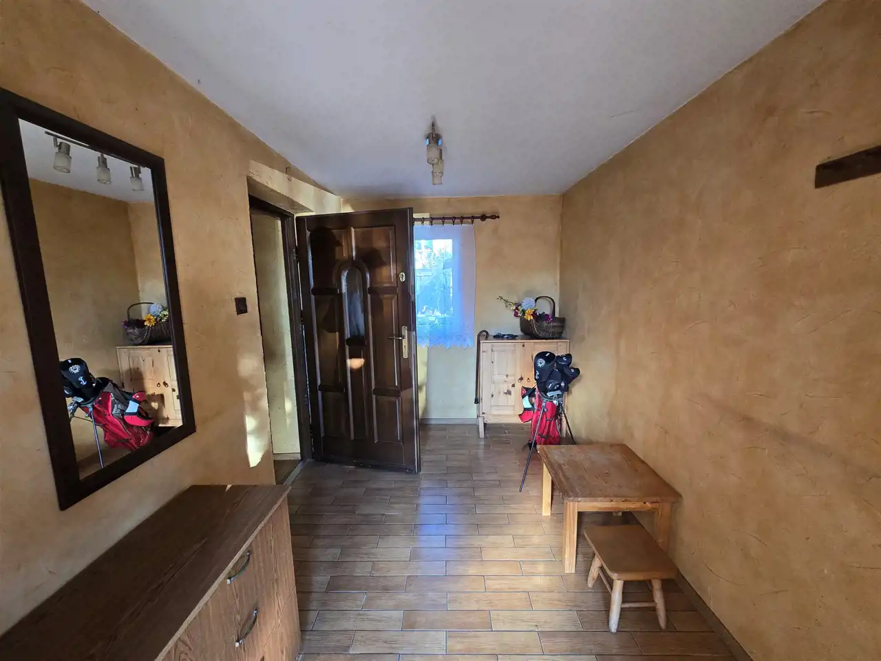Dom murowany (cegła + pustak), dach z blachy trapezowej, ocieplony (5 cm), otynkowany + elewacja ze strukturą. Parter domu z oknami PCV, piętro okna stare drewniane.