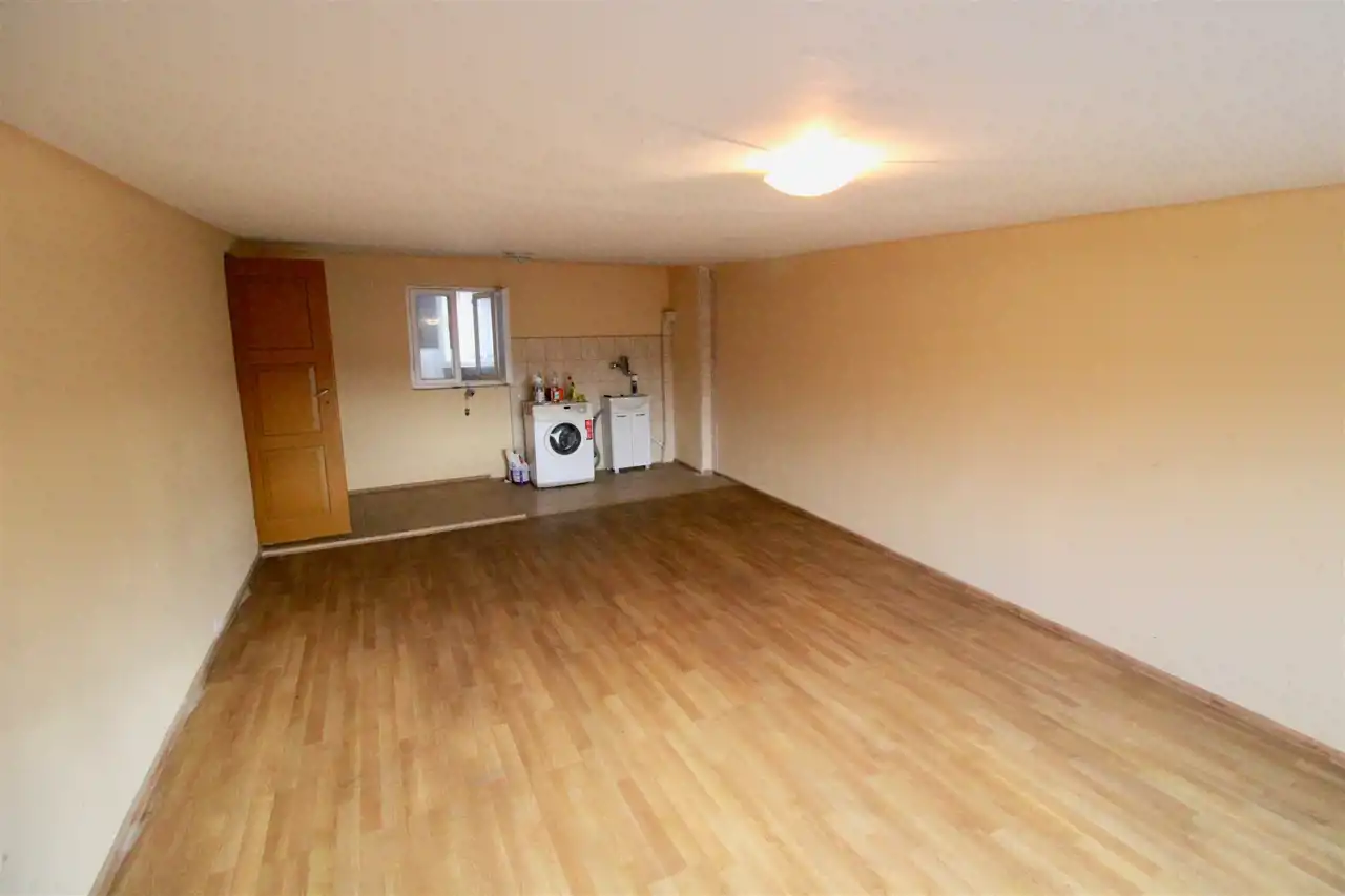 Z tarasu schody wiodą do ogrodu oraz pomieszczenia gospodarczego po byłym garażu, gdzie znajduje się piec na ekogroszek oraz instalacja grzewcza miejska MEC.
