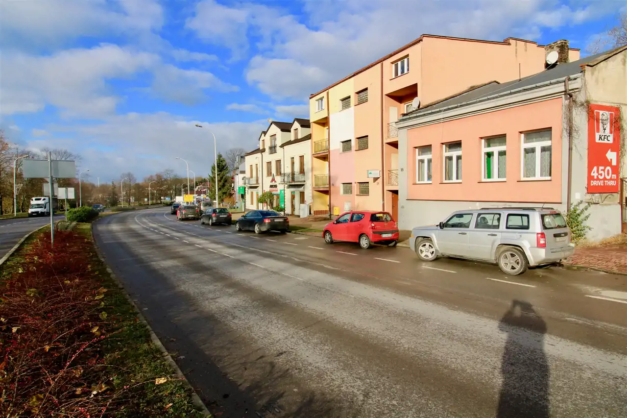 Na pierwszym piętrze znajduję się duży salon z balkonem, mniejszy pokój z wyjściem na taras i ogród oraz duża kuchnia i łazienka, na drugim piętrze znajdują się 3 sypialnie i łazienka, na poddaszu użytkowym z oknami natomiast znajdują się 2 pomieszczenia, w tym jedno przebudowane na pokój. Obydwa pomieszczenia z obniżonym sufitem. Wszystkie pietra łączy jedna wspólna, szeroka klatka schodowa zatem piętra mogą stanowić oddzielne mieszkania. Budynek przylega do chodnika i znajduje się przy głównej ulicy, co sprawia, że może być przeznaczony na lokale użytkowe do wynajęcia bądź oddzielne mieszkania.