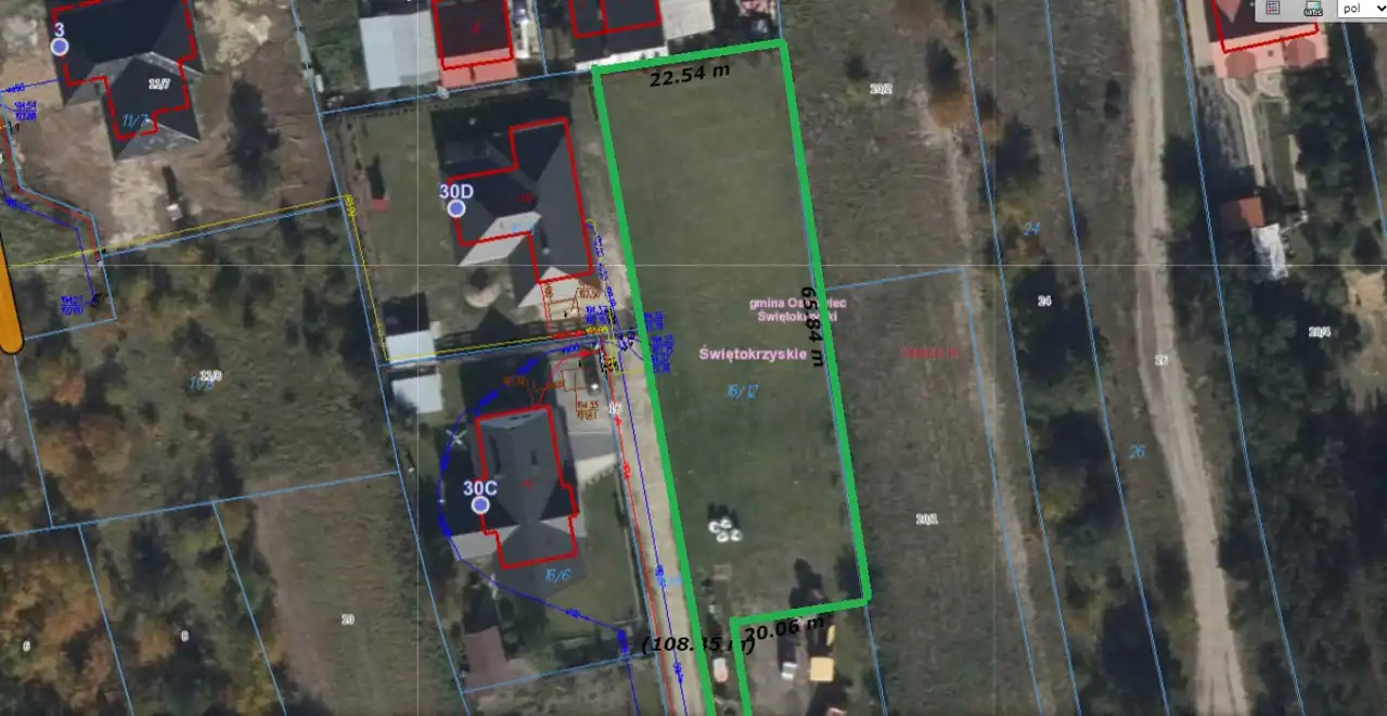 - Działka nr ewid. 16/12 obręb 16 o pow. 1502 m2 , ogrodzona metalową siatką, dojazd drogą utwardzoną żwirową