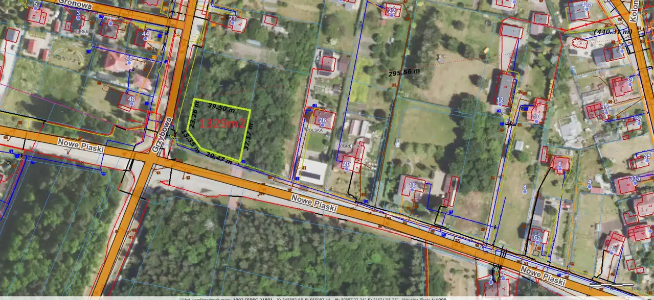 - Działka o pow. 1329 m2 nr ewidencyjny 44/6, obręb 06, kształt zbliżony do prostokąta (ścięty róg), o wymiarach ok. 39,5m x 37mx 29,5mx 15mx 23m. Wjazd na działkę od ul. Nowe Piaski wyłożony kostką betonową. Ulica Nowe Piaski jest po modernizacji drogi, piękne pobocze ze ścieżką rowerową. Działka na delikatnym wzniesieniu, oczyszczona z drzew w centralnej części. Vis-a-vis od ul. Grzybowej posesja nr 48. W wypisie z ewidencji gruntów oznaczenie użytków sa to sady S-R5.