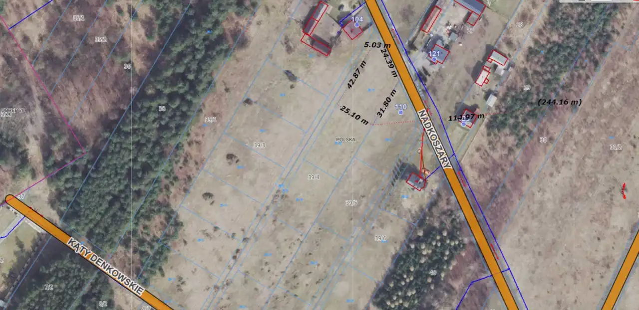 - Działka o pow. 1010m2, kształt trapez z dostępem do drogi szutrowej ul. Nadkoszary i drogi gruntowej, wewnętrznej, łączącej ul. Kąty Denkowskie i ul. Nadkoszary. Droga dojazdowa wewnętrzna to działki ewidencyjne nr 39/15 i 39/16.