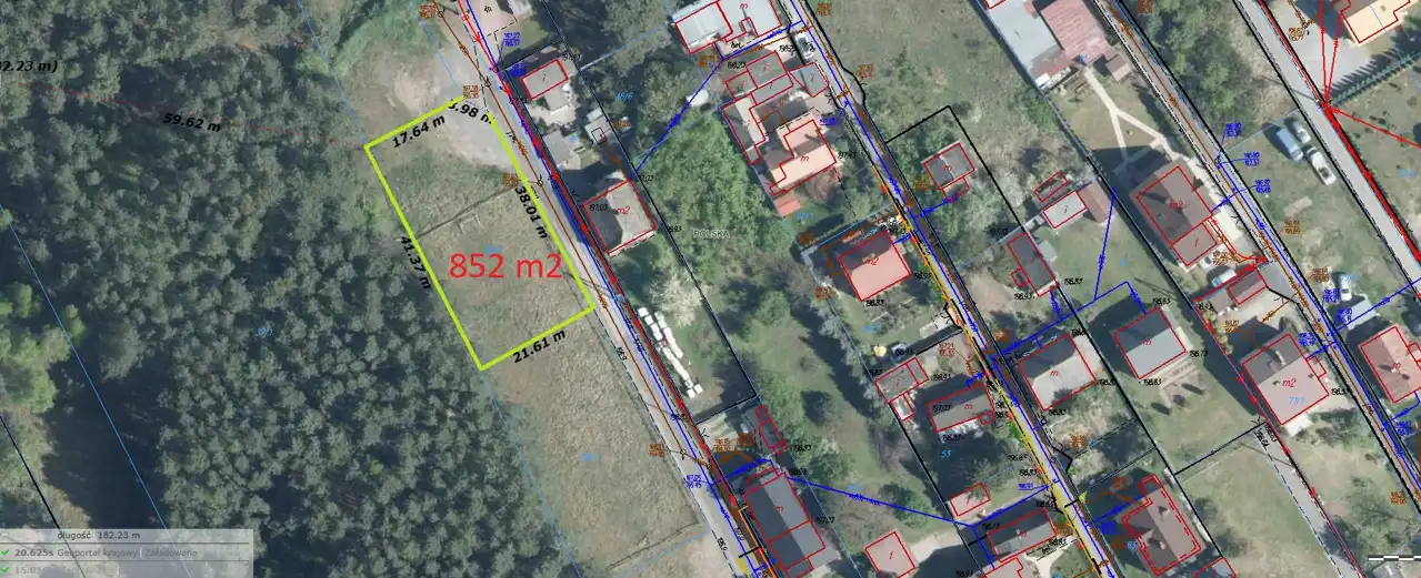- Działka o pow.852 m2 nr ewidencyjny 38/8 obręb 21, kształt zbliżony do prostokąta (ścięty róg), o wymiarach ok. 41m szeroka x 21m. Działka z dostępem do drogi ziemnej, utwardzonej 41m..