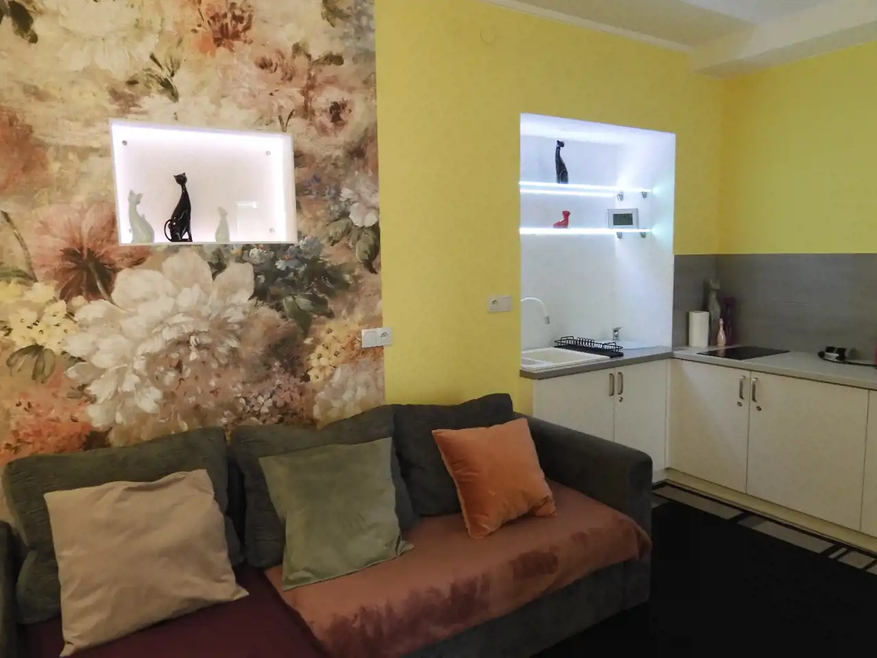 2. Mieszkanie na parterze o pow. 42m2 - dwa pokoje z czego jeden z aneksem kuchennym, łazienka; nowoczesny wystrój mieszkania.