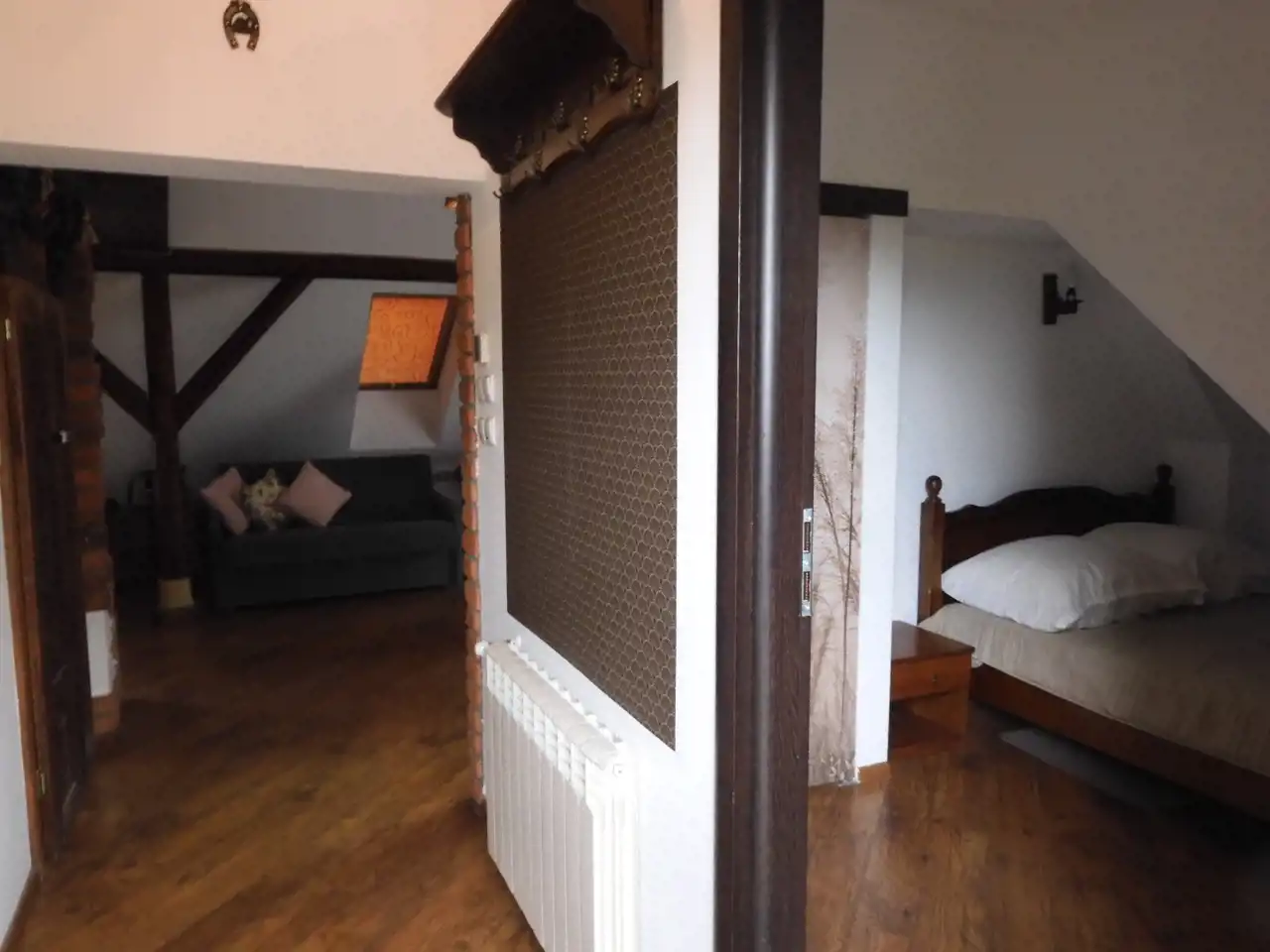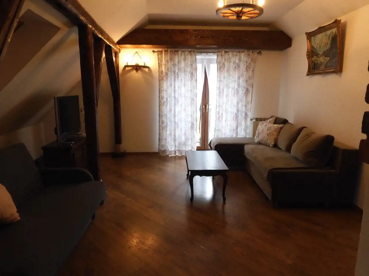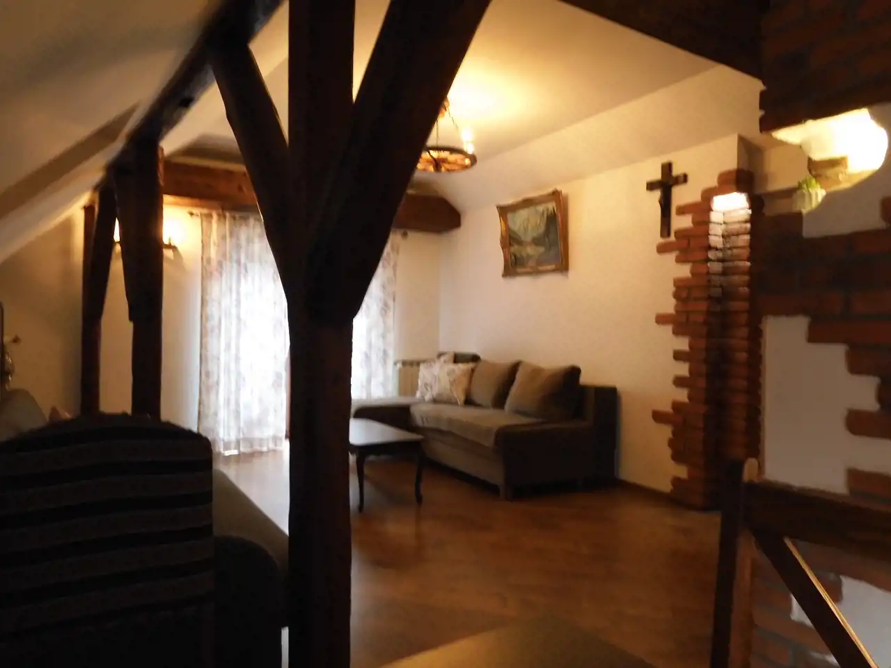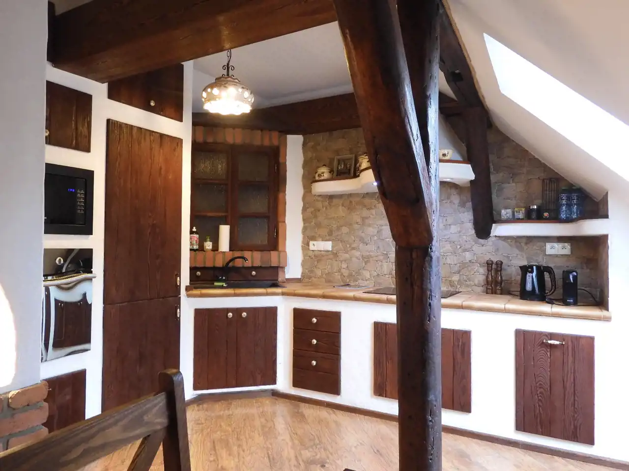 3. Mieszkanie na poddaszu o pow. 70m2 - duży salon z aneksem kuchennym, pokój, łazienka; stylowy wystrój mieszkania.