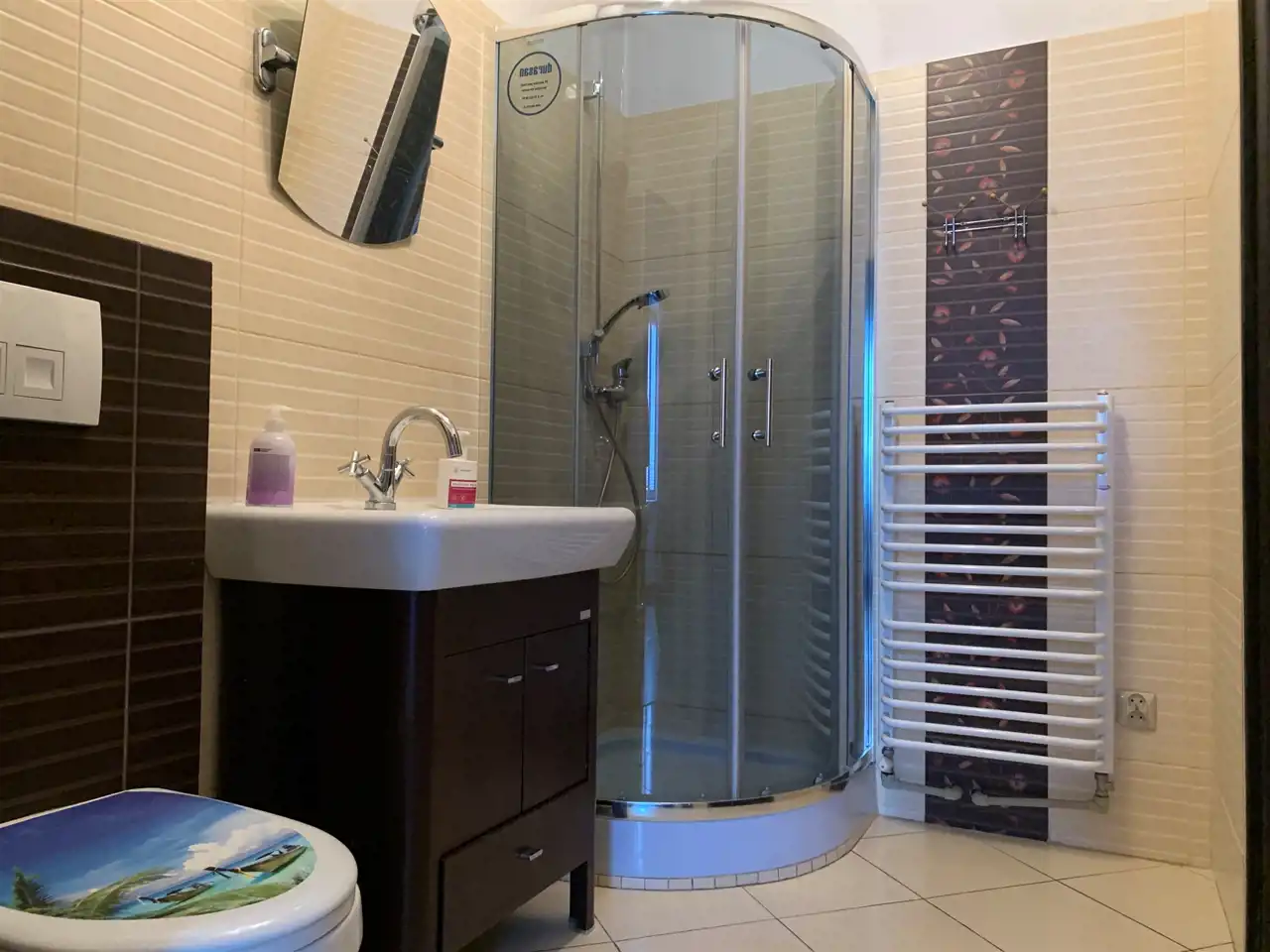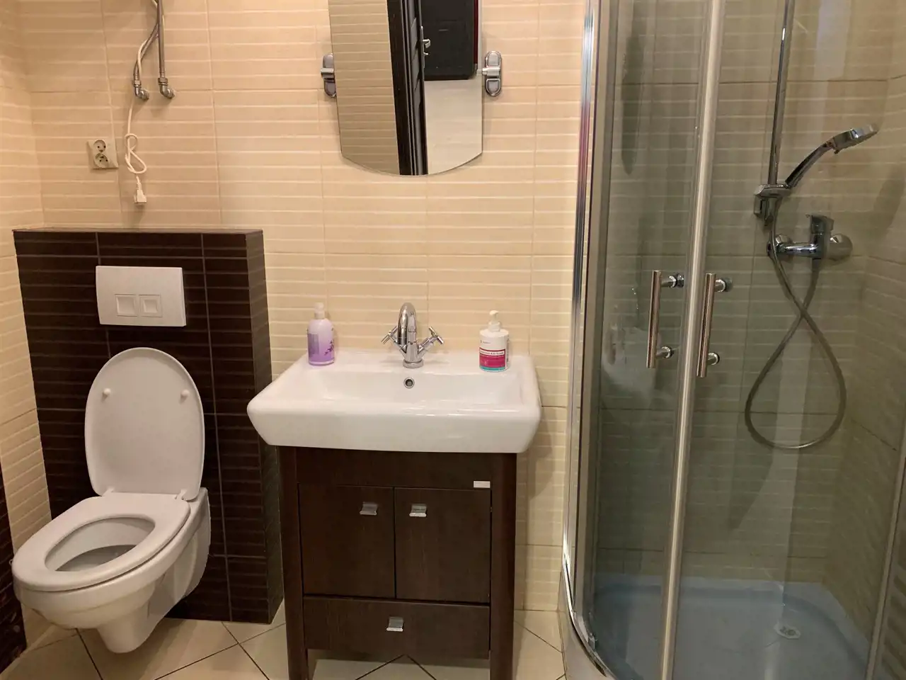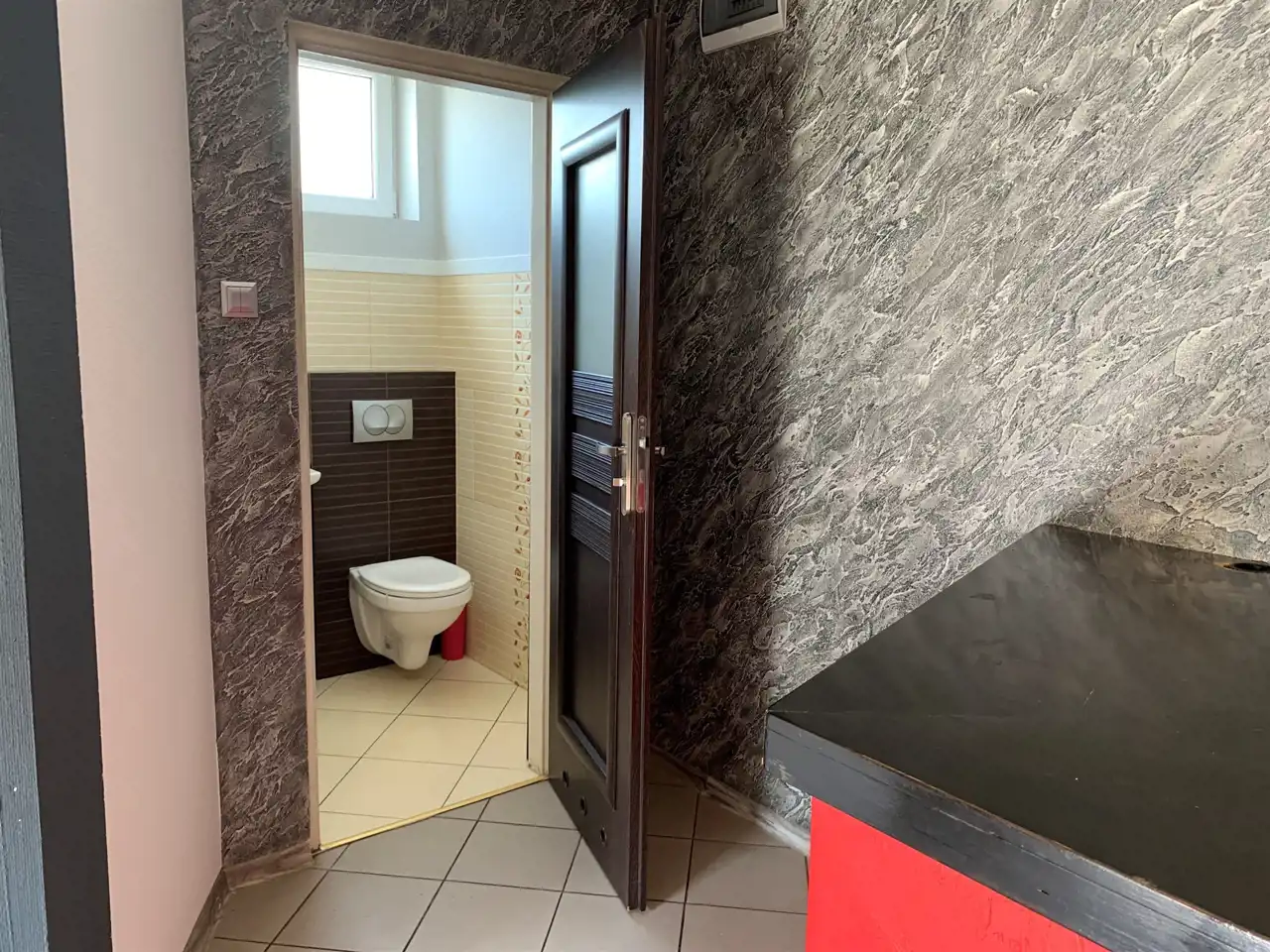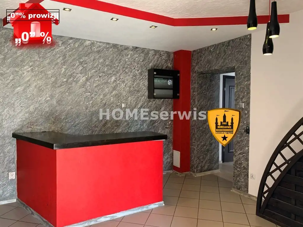 W lokalu 2 łazienki, recepcja z konsolą, pomieszczenie gospodarcze, aneks kuchenny, stanowisko do dezynfekcji.
