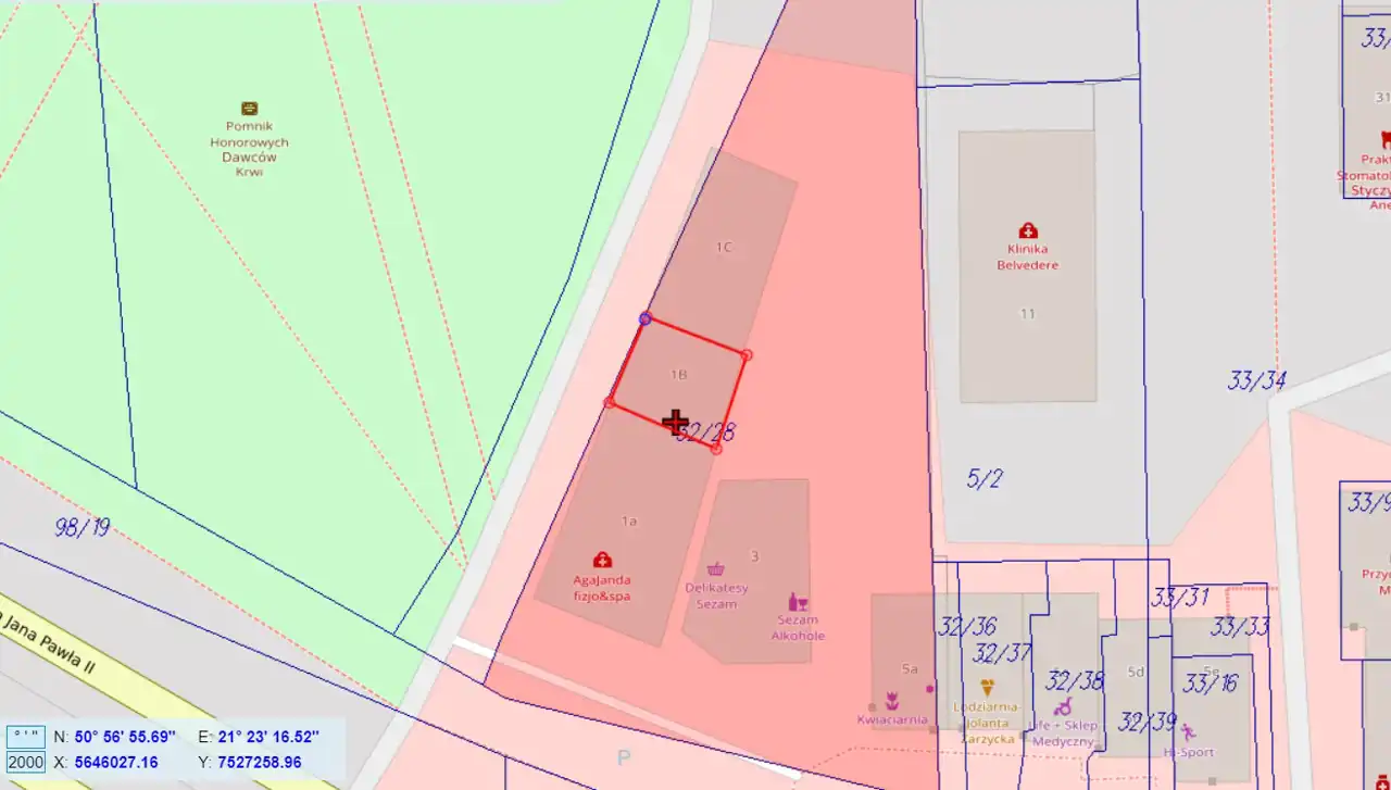 Budynek handlowo-usługowy posadowionego jest na dzierżawionej od spółdzielni działce o pow. 121 m2 (w okresie letnim 134,56 m2 ogródek letni).