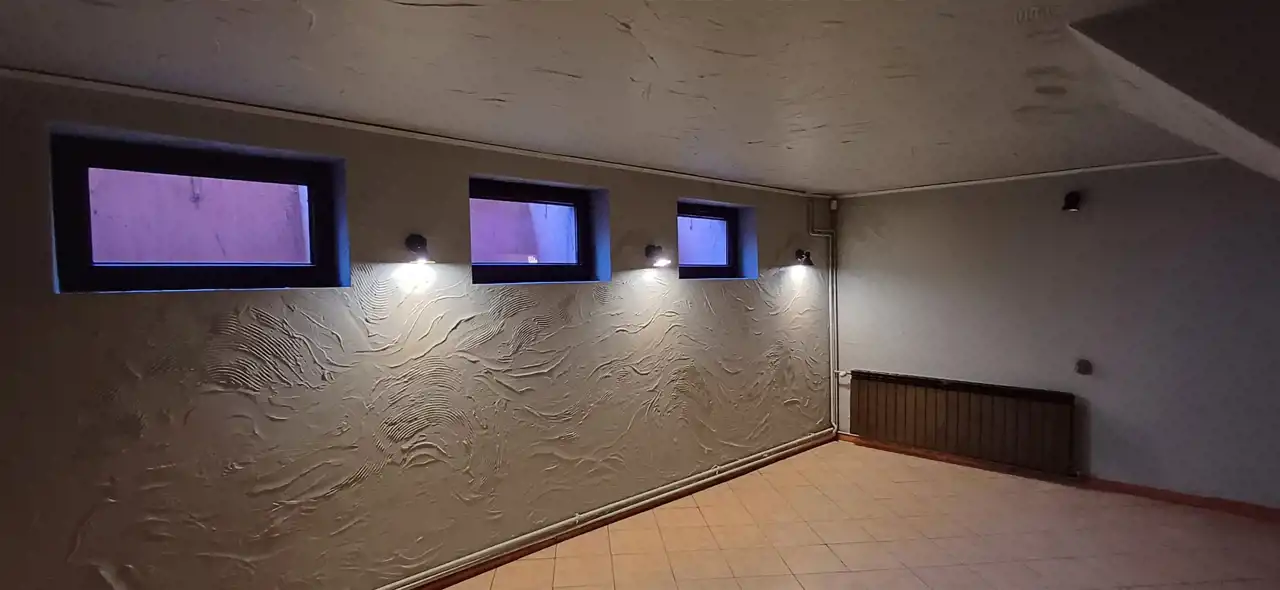 Na poziomie -1 znajduje się druga sala konsumpcyjna, kuchnia, magazyn, kotłownia.