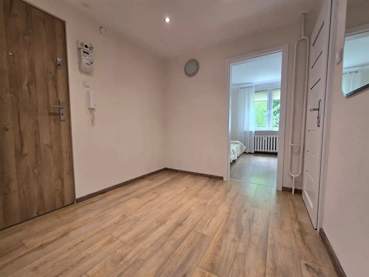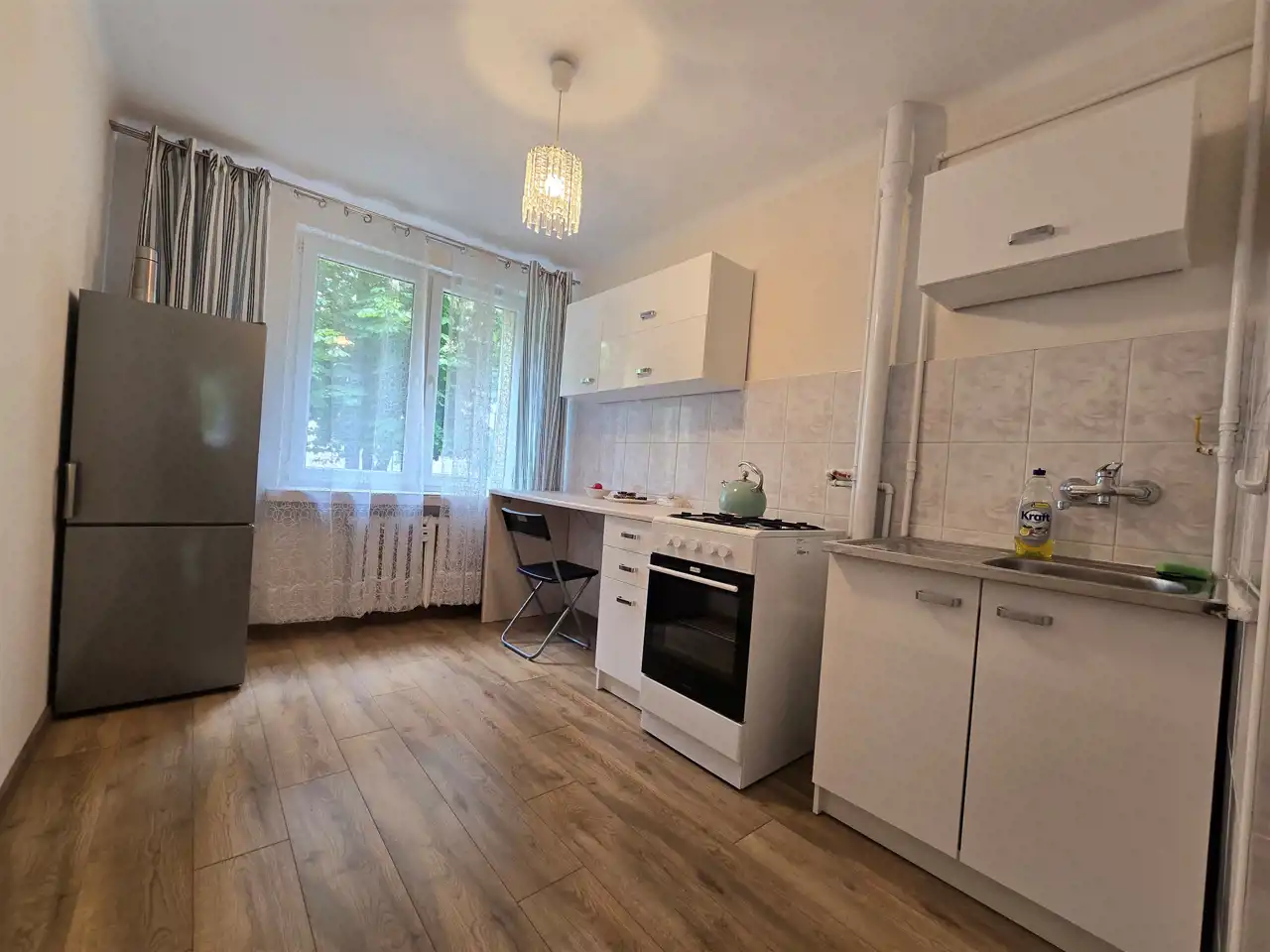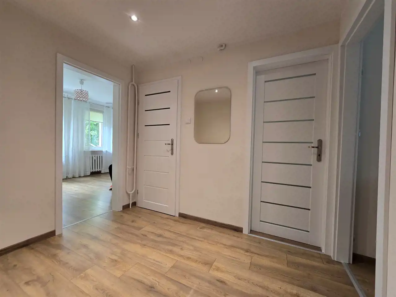 Okna PCV, na ścianach gładzie, na podłodze nowe panele i płytki, nowe drzwi zewnętrzne i wewnętrzne.