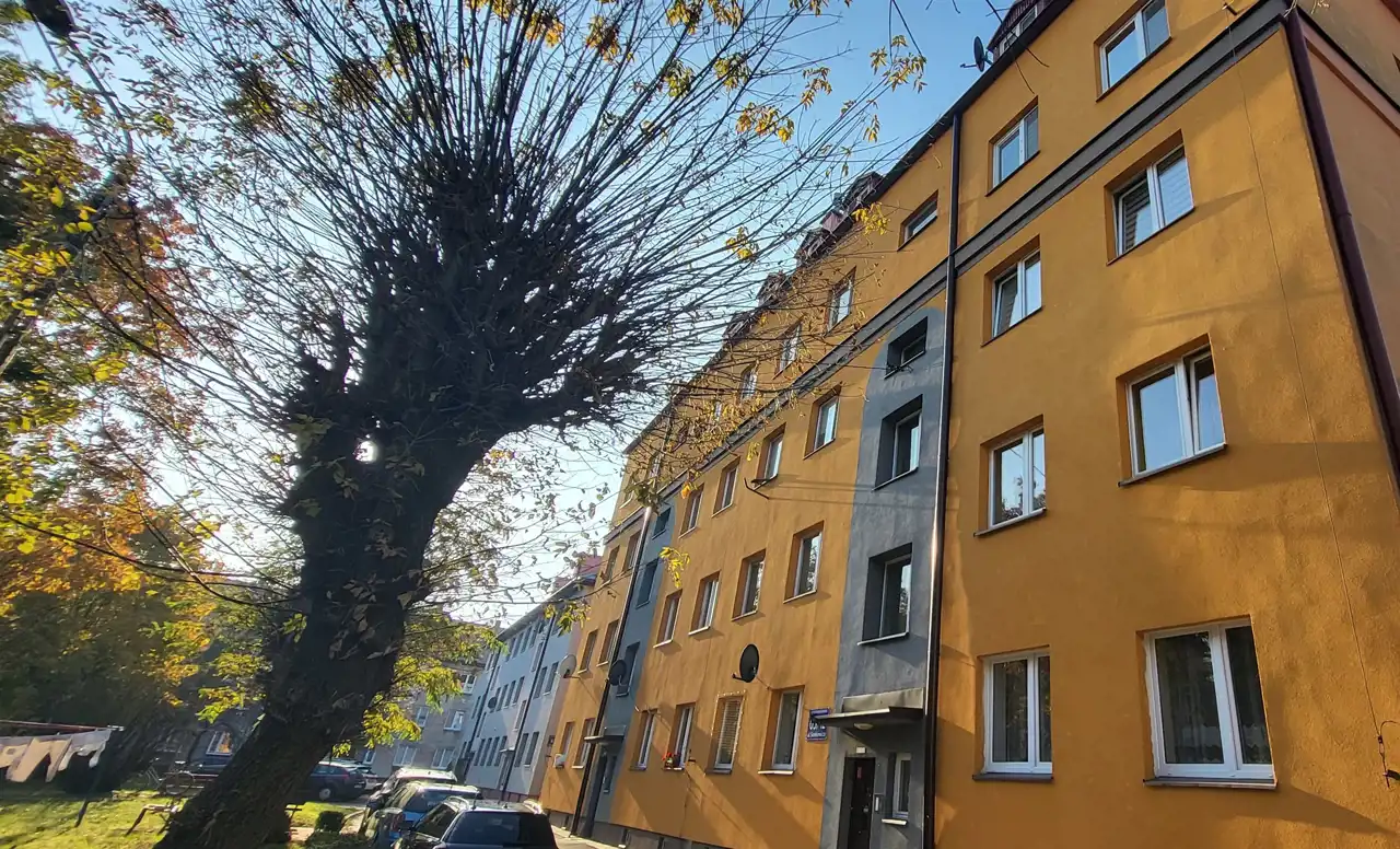 Blok ocieplony, klatki z domofonami, wokół dużo zieleni, cicha spokojna okolica.